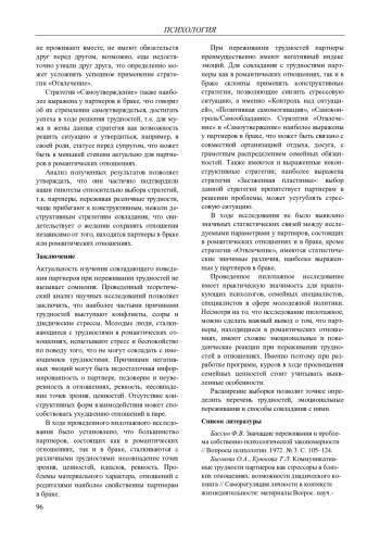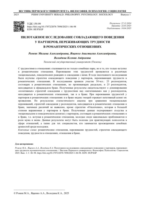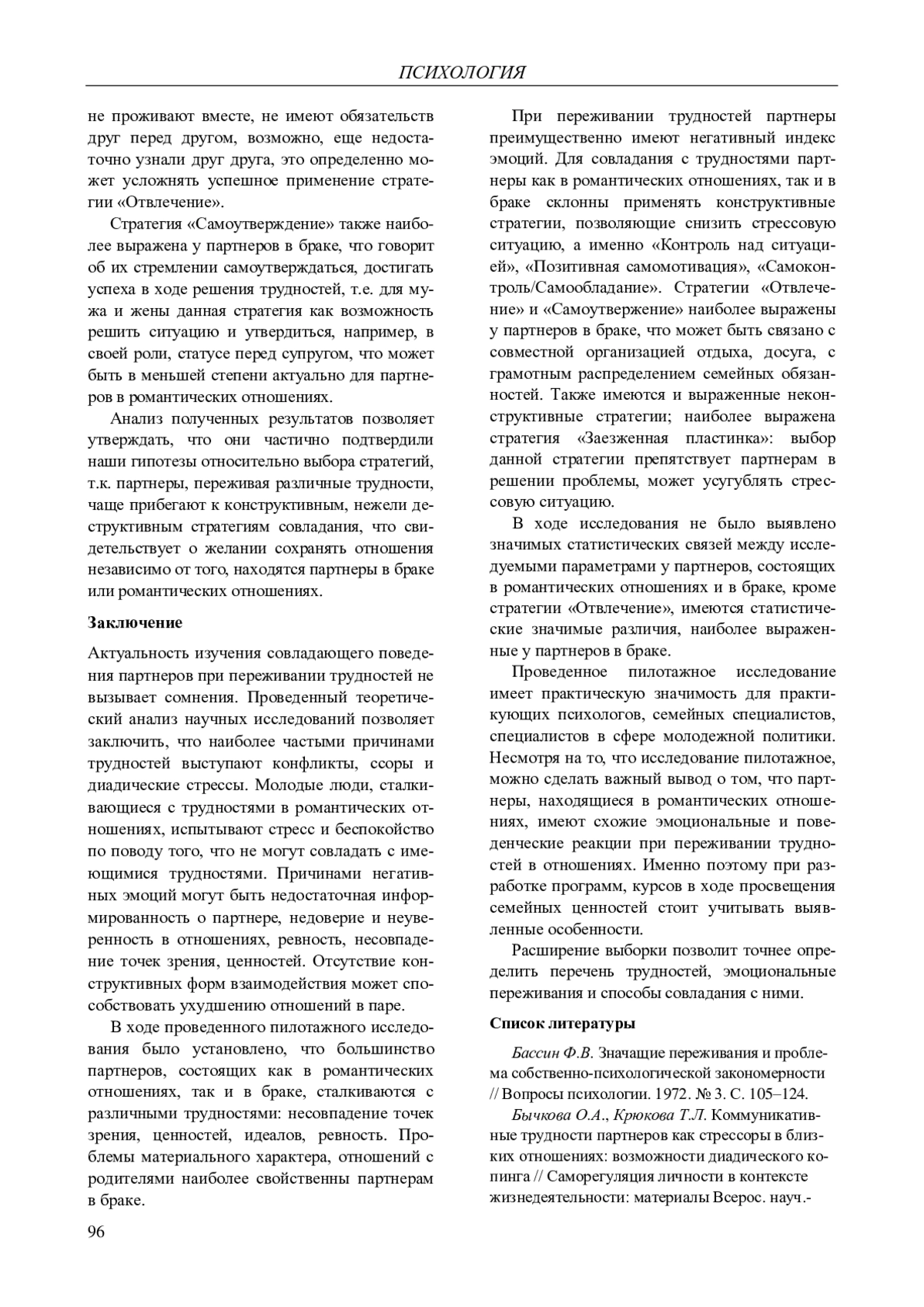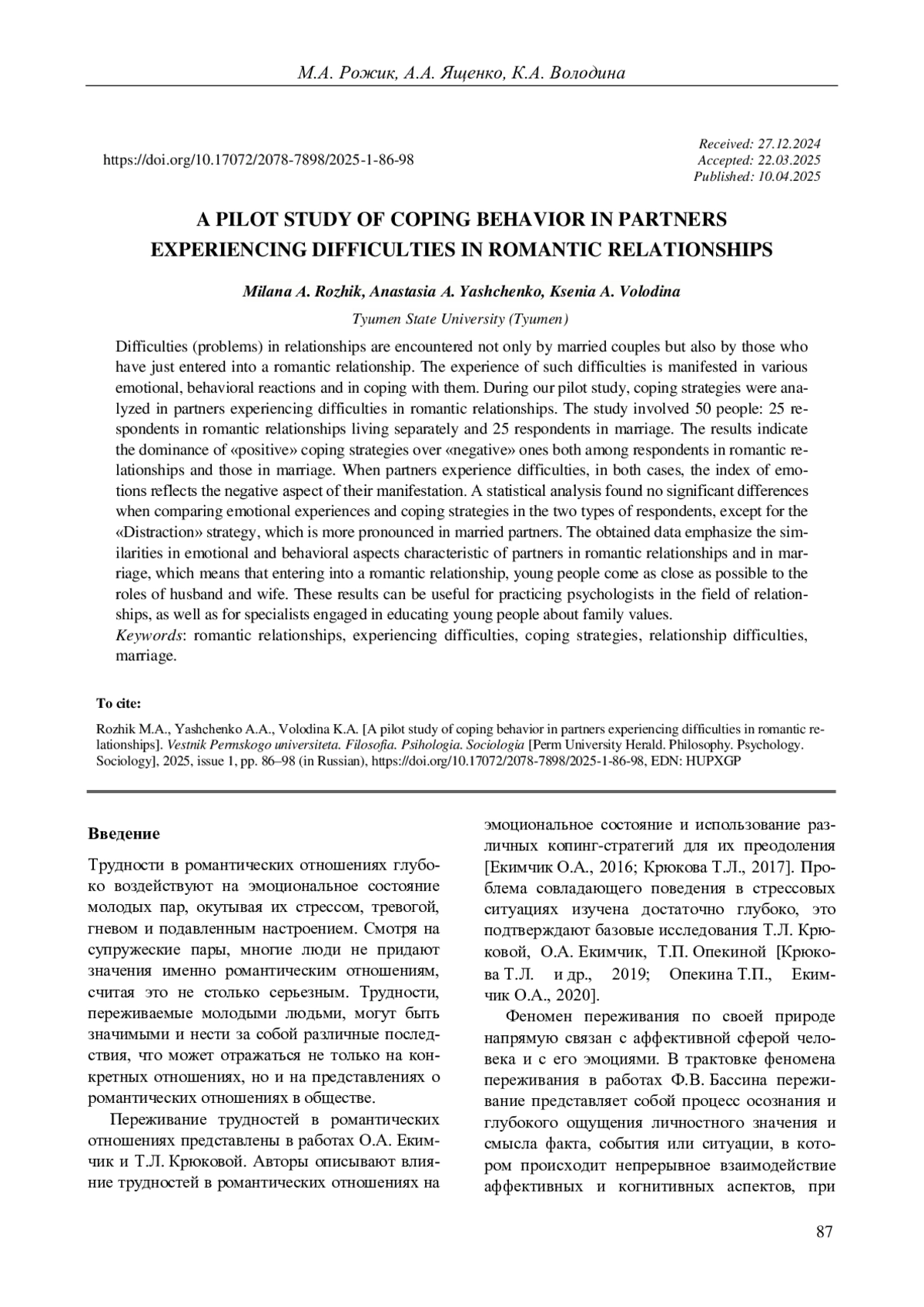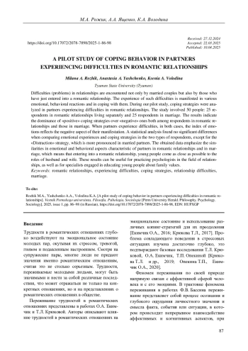 С трудностями в отношениях сталкиваются не только семейные пары, но и те, кто только вступил в романтические отношения. Переживание этих трудностей проявляется в различных эмоциональных, поведенческих реакциях и совладания с ними. В ходе пилотажного исследования были изучены стратегии совладающего поведения у партнеров, переживающих трудности в романтических отношениях. В исследовании приняли участие 50 чел.: 25 респондентов, состоящих в романтических отношениях, но проживающих раздельно, и 25 респондентов, находящихся в официальном браке. Полученные результаты свидетельствуют о доминировании «позитивных» стратегий совладания с трудностями над «негативными» как у респондентов, находящихся в романтических отношениях, так и в браке. При переживании трудностей у партнеров в романтических отношениях и в браке индекс эмоций отражает негативный аспект их проявления. По результатам статистического анализа при сравнении эмоциональных переживаний, стратегий совладания у респондентов, находящихся в романтических отношения и браке, значимых различий не выявлено, кроме стратегии «Отвлечение», которая в большей степени выраженная у партнеров в браке. Полученные данные подчеркивают сходства в эмоциональном и поведенческом аспектах у партнеров, состоящих в романтических отношениях и в браке, т. е. вступая в романтические отношения, молодые люди максимально приближаются к роли мужа и жены. Данные результаты могут быть полезны для практикующих психологов в сфере отношений, а также для тех специалистов, кто занимается просвещением семейных ценностей среди молодежи.