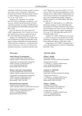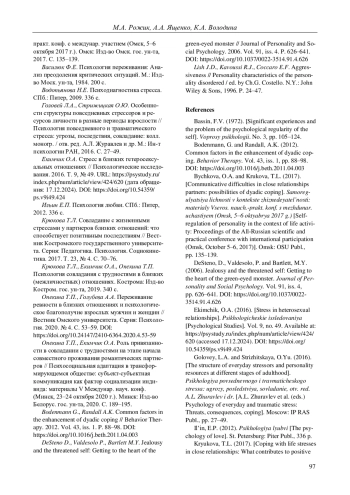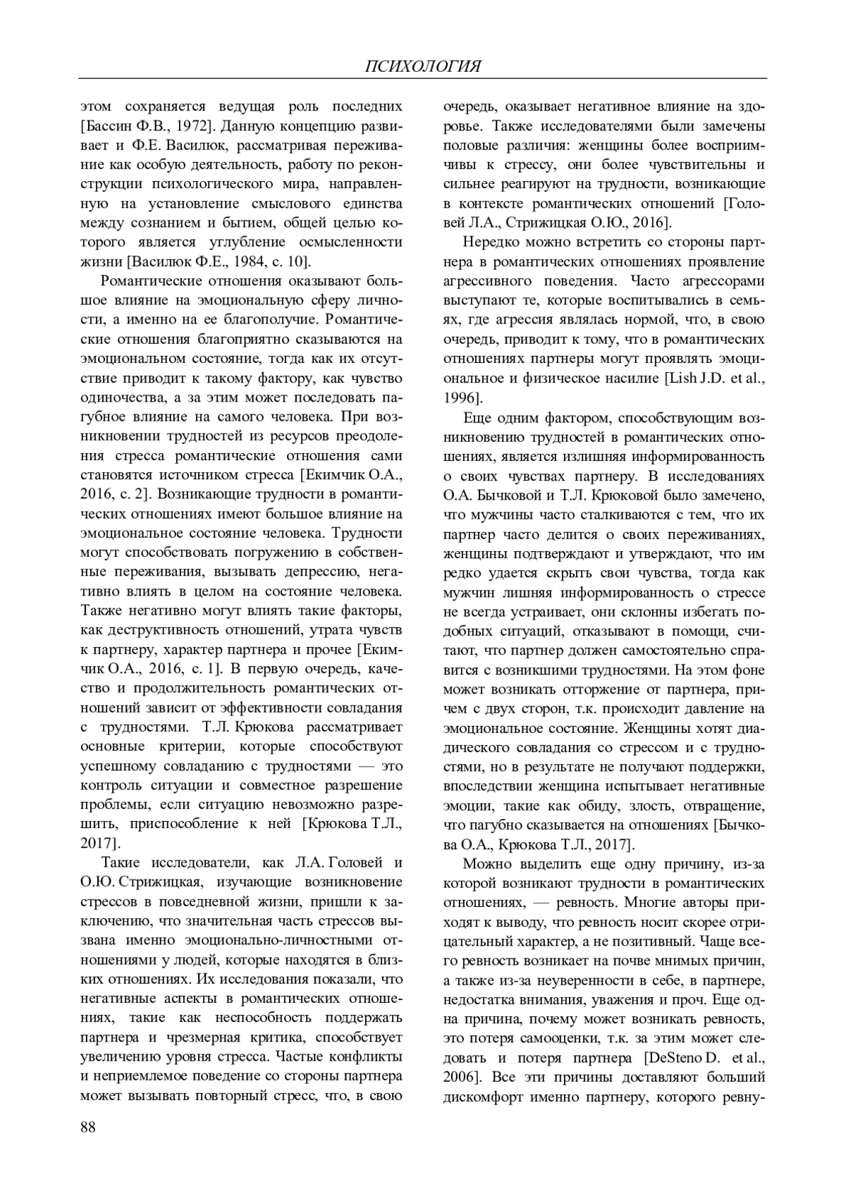 2. Бычкова О.А., Крюкова Т.Л. Коммуникативные трудности партнеров как стрессоры в близких отношениях: возможности диадического копинга // Саморегуляция личности в контексте жизнедеятельности: материалы Всерос. науч.-практ. конф. с междунар. участием (Омск, 5-6 октября 2017 г.). Омск: Изд-во Омск. гос. ун-та, 2017. С. 135-139. EDN: YQURNZ