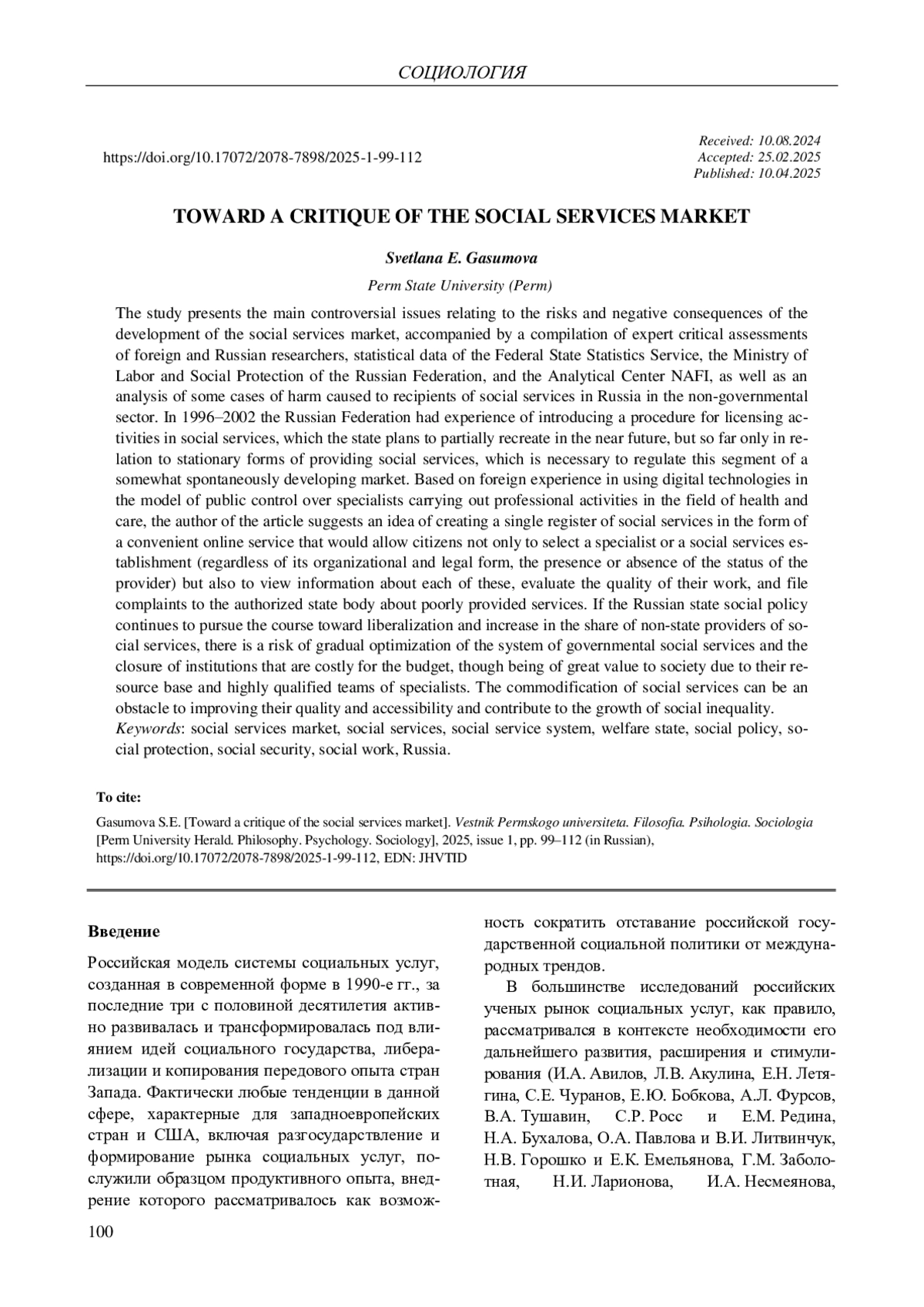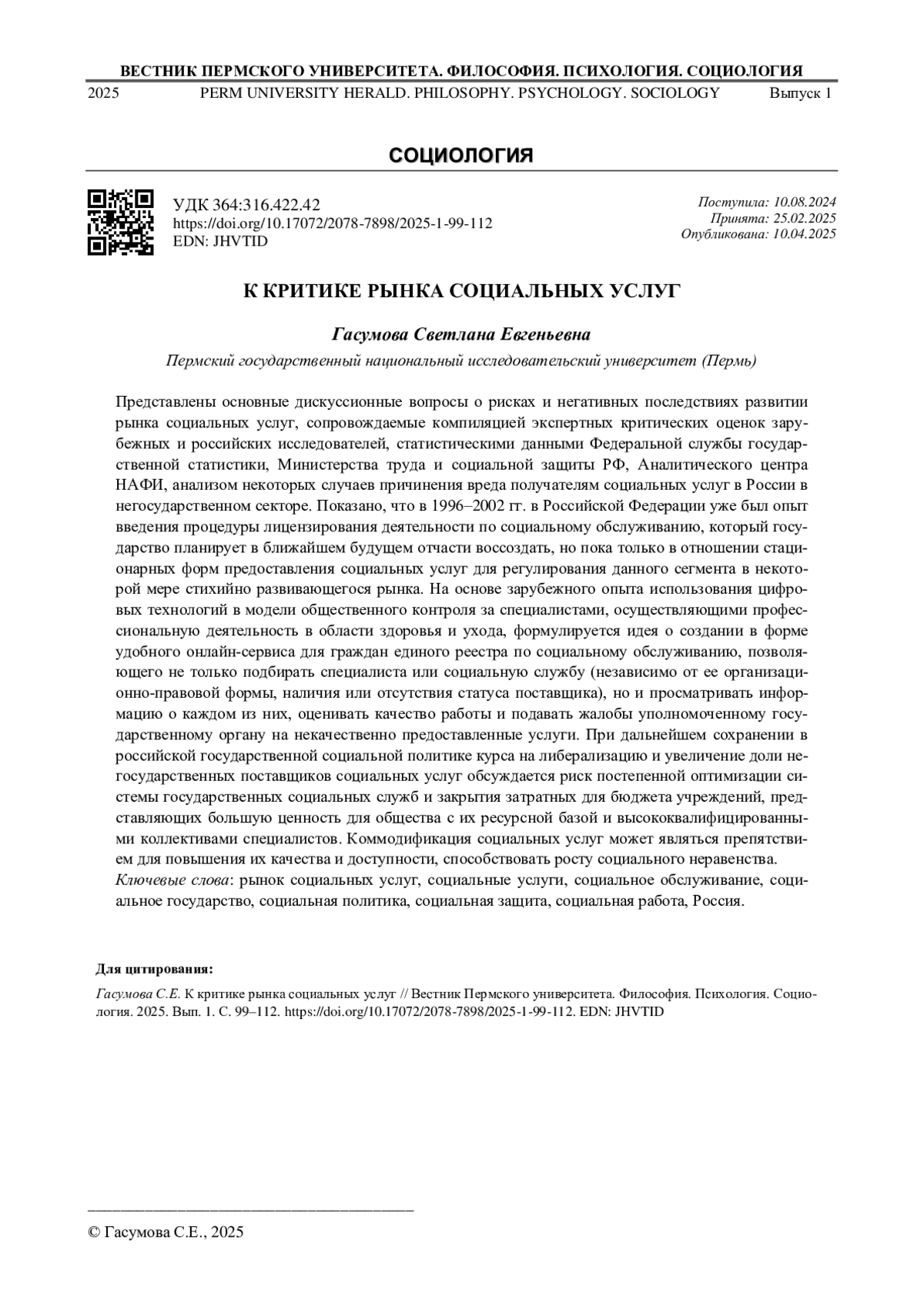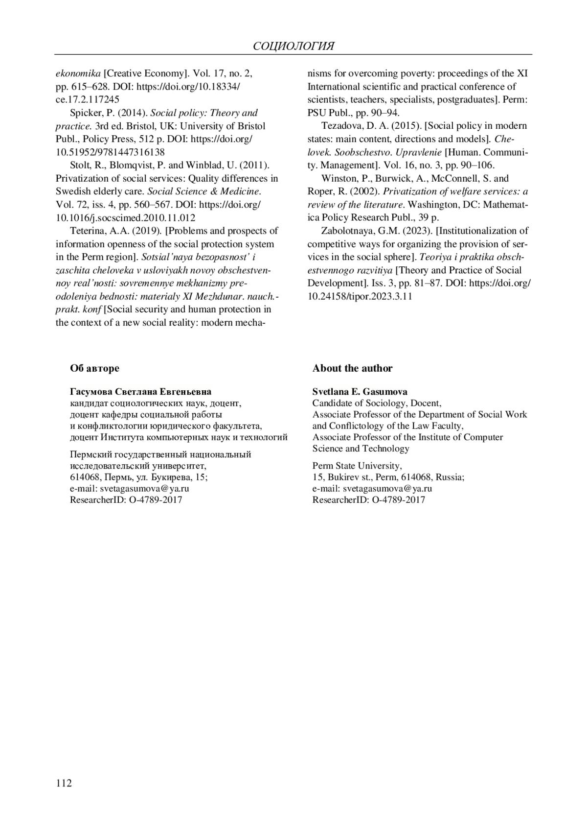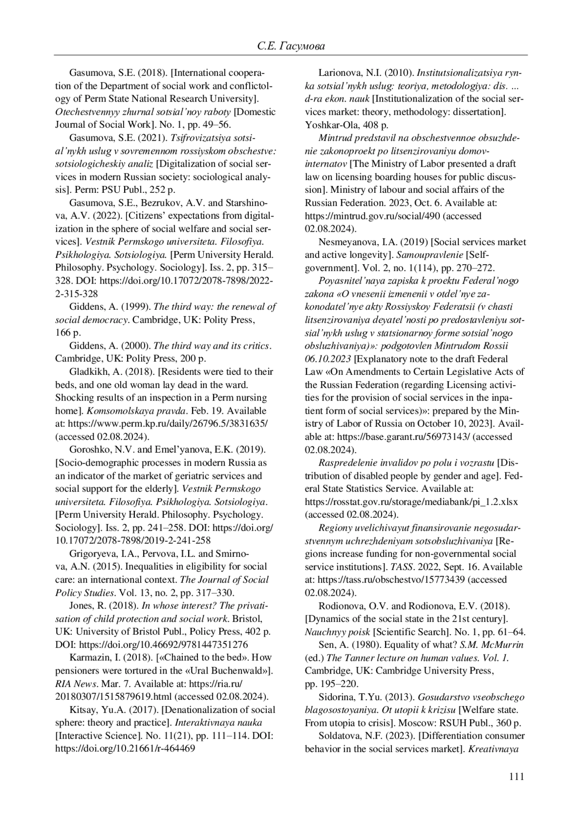 10. Гасумова С.Е., Безруков А.В., Старшинова А.В. Ожидания граждан от цифровизации в сфере социальной защиты и социальных услуг // Вестник Пермского университета. Философия. Психология. Социология. 2022. Вып. 2. С. 315-328. DOI: 10.17072/2078-7898/2022-2-315-328 EDN: PBENVH