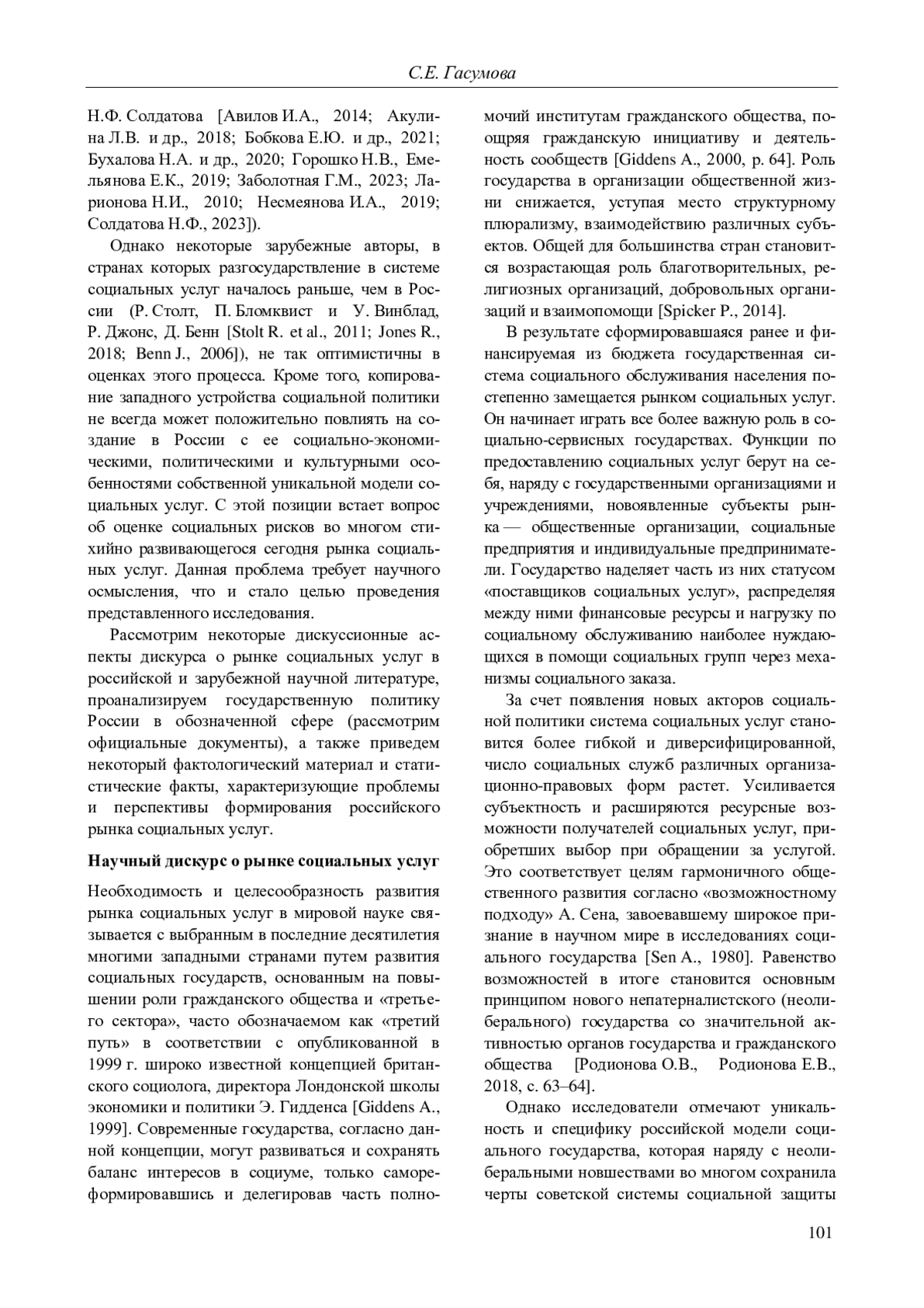 Российская модель системы социальных услуг, созданная в современной форме в 1990-е гг., за последние три с половиной десятилетия активно развивалась и трансформировалась под влиянием идей социального государства, либерализации и копирования передового опыта стран Запада. Фактически любые тенденции в данной сфере, характерные для западноевропейских стран и США, включая разгосударствление и формирование рынка социальных услуг, послужили образцом продуктивного опыта, внедрение которого рассматривалось как возможность сократить отставание российской государственной социальной политики от международных трендов.
