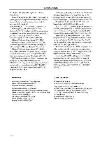 18. Парфенова О.А., Галкин К.А. Социальная активность и участие пожилых россиян в контексте активного долголетия // Журнал социологии и социальной антропологии. 2023. Т. 26, № 1. С. 200-223. DOI: 10.31119/jssa.2023.26.1.8 EDN: MIXCWZ