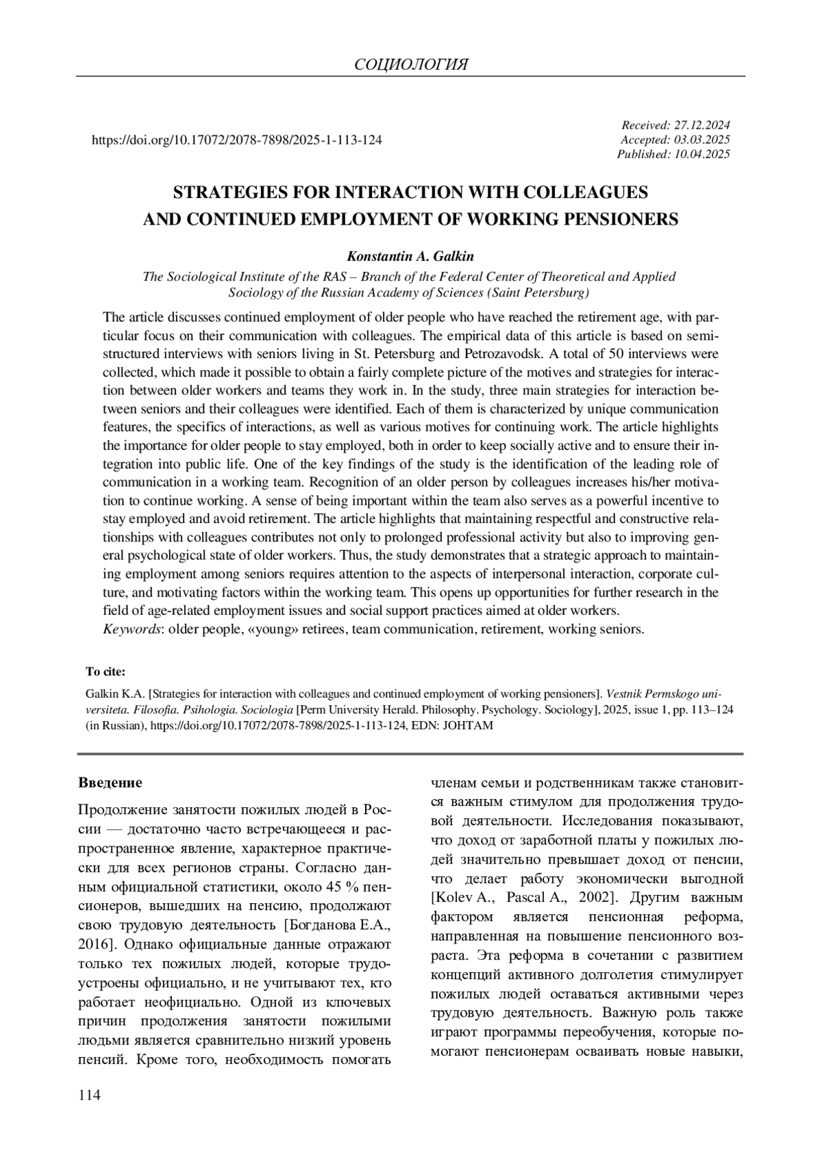 В статье рассмотрены особенности коммуникации с коллективом и продолжения занятости пожилых людей, достигших пенсионного возраста. Основой эмпирических данных настоящей статьи стали полуструктурированные интервью с пожилыми людьми, проживающими в Санкт-Петербурге и Петрозаводске. Всего было собрано 50 интервью, что позволило получить достаточно полное представление о мотивах и стратегиях взаимодействия пожилых работников с коллективами. В рамках проведенного исследования были выделены три основные стратегии взаимодействия пожилых людей с коллективом на работе. Каждая из них характеризуется уникальными особенностями коммуникации, спецификой взаимодействий, а также различными мотивами продолжения трудовой деятельности. В статье подчеркивается важность сохранения занятости пожилыми людьми как для поддержания их социальной активности, так и для обеспечения их интегрированности в общественную жизнь. Одной из ключевых находок исследования стало выявление ведущей роли коммуникации в коллективе. Признание пожилого человека со стороны коллег усиливает его мотивацию продолжать работать. Ощущение значимости в коллективе также служит мощным стимулом для сохранения занятости и отказа от выхода на пенсию. В статье особо отмечено, что поддержание уважительных и конструктивных отношений в коллективе способствует не только продлению профессиональной активности, но и улучшению общего психологического состояния пожилых работников. Таким образом, исследование демонстрирует, что стратегический подход к поддержанию занятости пожилых людей требует внимания к аспектам межличностного взаимодействия, корпоративной культуры и мотивирующих факторов внутри трудового коллектива. Это открывает возможности для дальнейших исследований в области возрастной занятости и социальных практик поддержки пожилых работников.