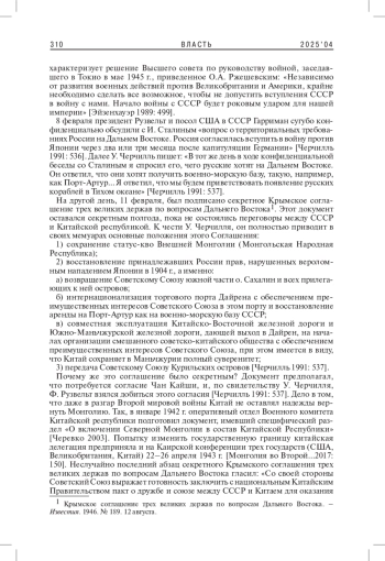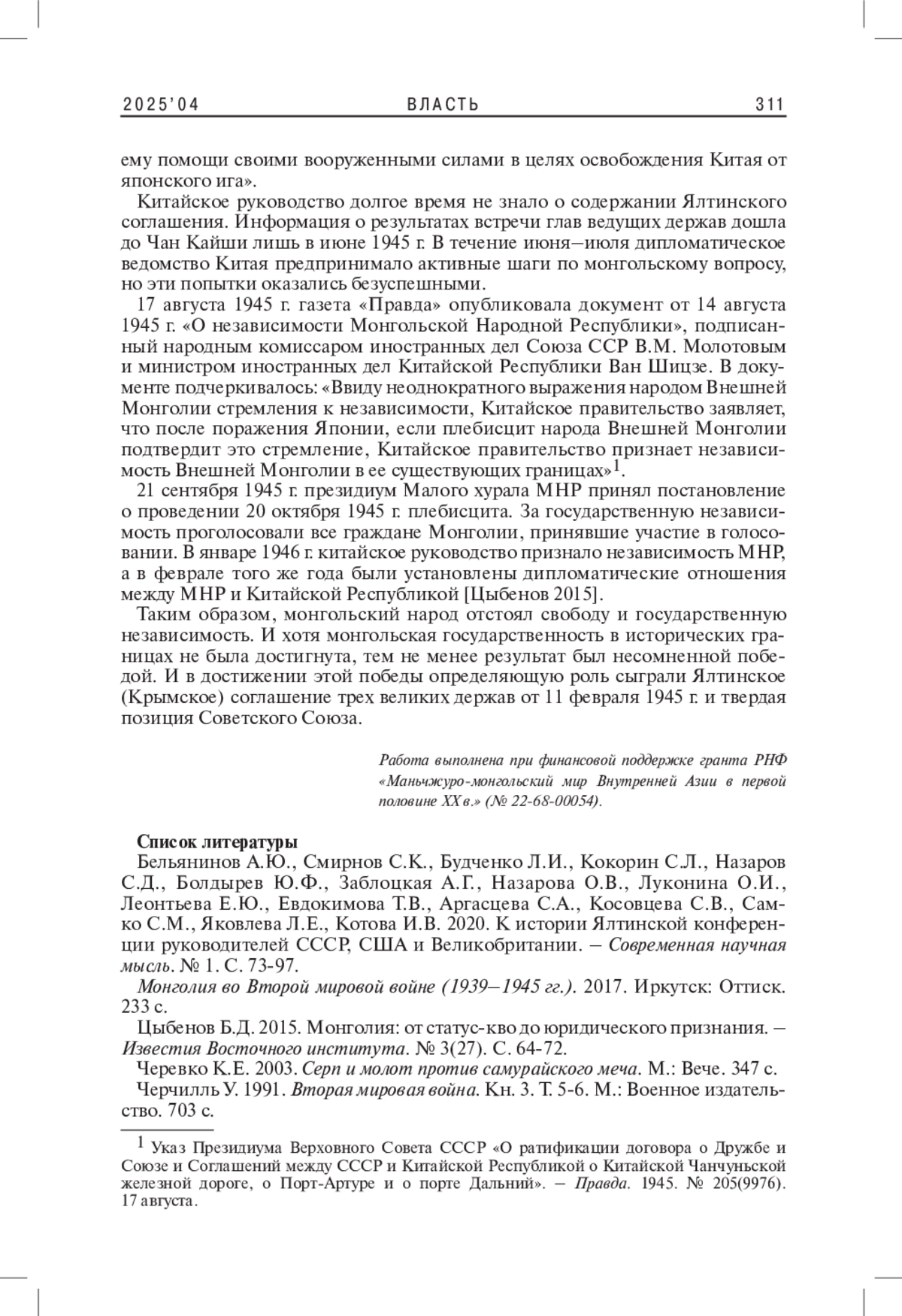 1. Бельянинов А.Ю., Смирнов С.К., Будченко Л.И., Кокорин С.Л., Назаров С.Д., Болдырев Ю.Ф., Заблоцкая А.Г., Назарова О.В., Евдокимова Т.В., Аргасцева С.А., Косовцева С.В., Самко С.М., Яковлева Л.Е., Котова И.В. 2020. К истории Ялтинской конференции руководителей СССР, США и Великобритании. - Современная научная мысль. № 1. С. 73-97. EDN: MAKVZR