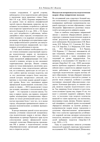 Проблема воспроизводства педагогических кадров в системе образования длительный период времени находится в центре внимания не только самого профессионального сообщества и органов управления образованием, но и исследователей. Контексты подобного интереса могут быть разнообразными: от соответствия педагогических работников новым требованиям к подготовке и квалификации, эффективной профессиональной подготовки потенциальных работников, до попыток оценить потребность в новых работниках. Последний аспект в настоящее время становится все более и более актуальным.