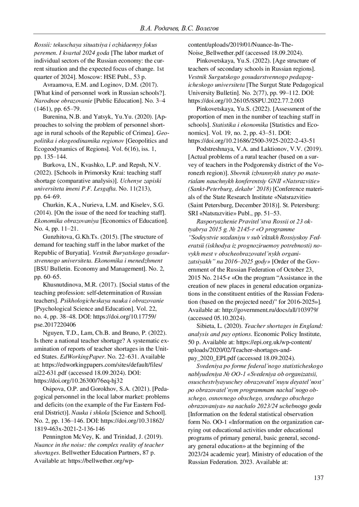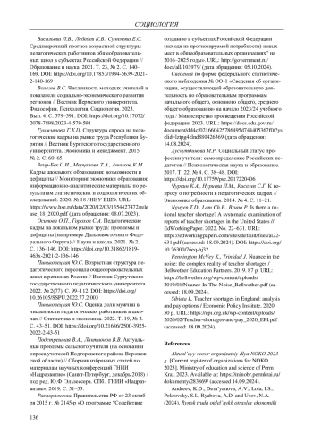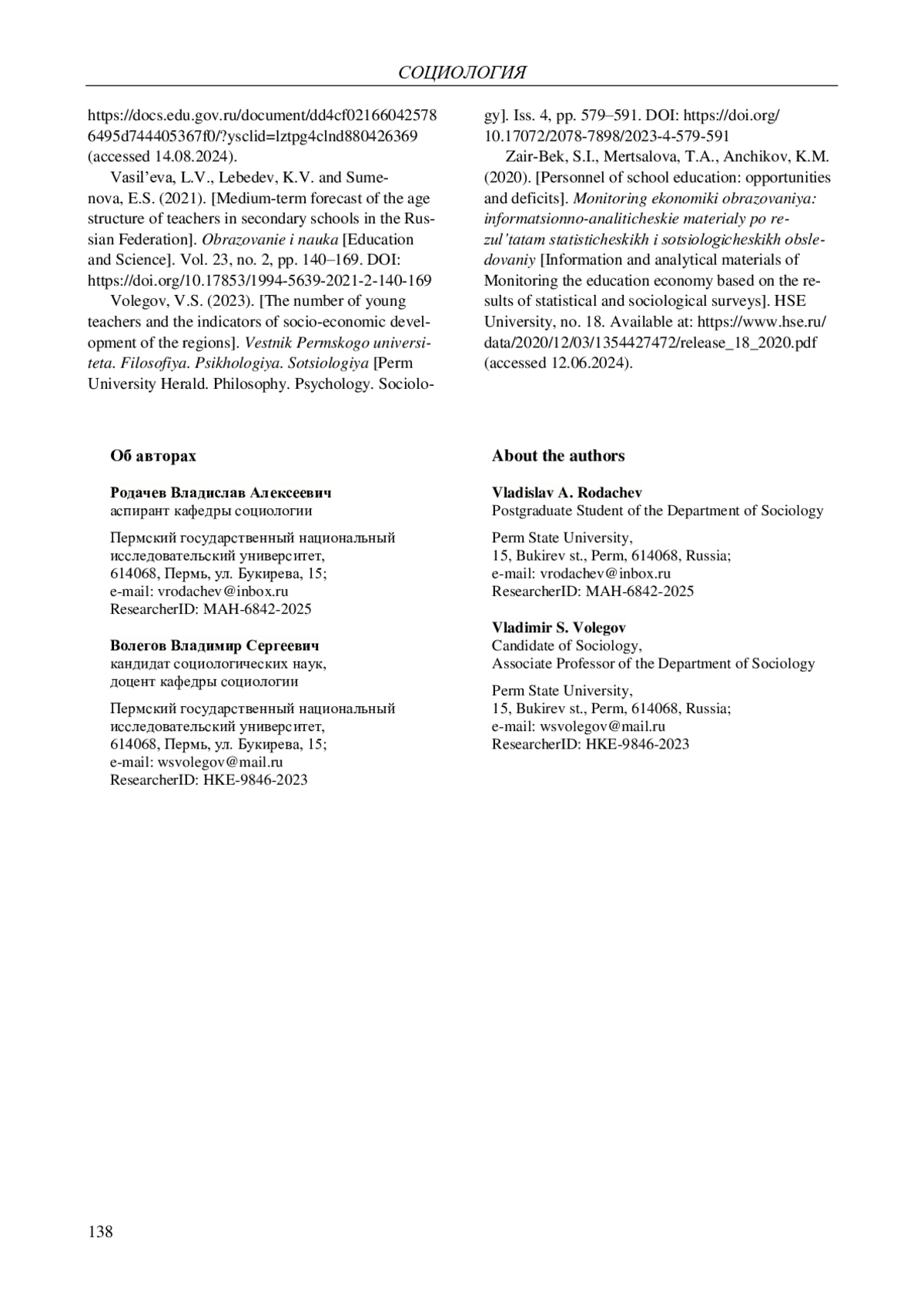 7. Волегов В.С. Численность молодых учителей и показатели социально-экономического развития регионов // Вестник Пермского университета. Философия. Психология. Социология. 2023. Вып. 4. С. 579-591. DOI: 10.17072/2078-7898/2023-4-579-591 EDN: HRDZPF