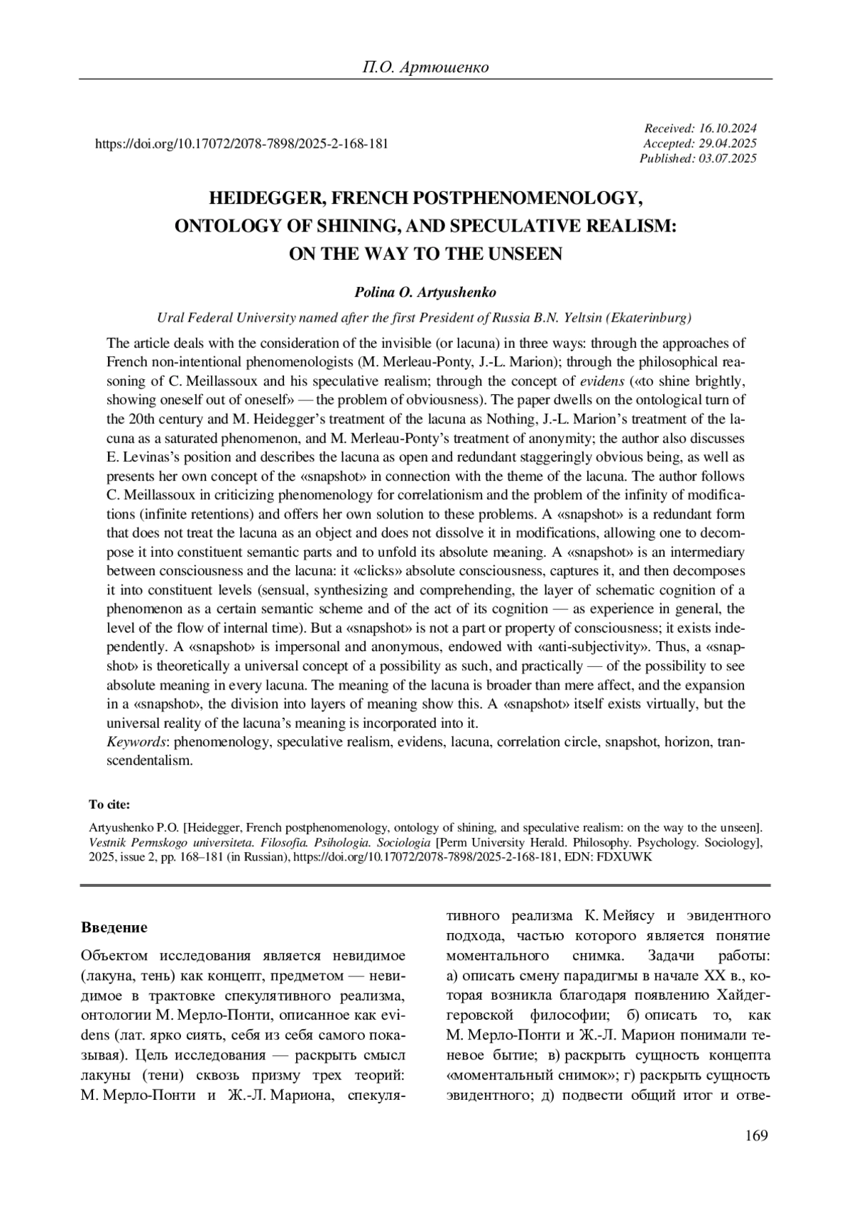 Объектом исследования является невидимое (лакуна, тень) как концепт, предметом — невидимое в трактовке спекулятивного реализма, онтологии М. Мерло-Понти, описанное как evidens (лат. ярко сиять, себя из себя самого показывая). Цель исследования — раскрыть смысл лакуны (тени) сквозь призму трех теорий: М. Мерло-Понти и Ж.-Л. Мариона, спекулятивного реализма К. Мейясу и эвидентного подхода, частью которого является понятие моментального снимка.