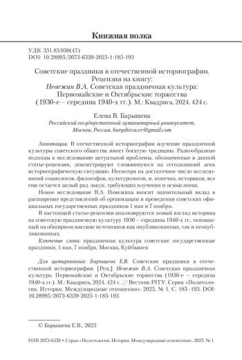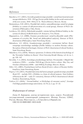 1. Барышева 2021 - Барышева Е.В. Советский государственный праздник в социальном конструировании нового общества, 1918-1941 гг.: Дис. ... д-ра ист. наук. М., 2021. 408 с.