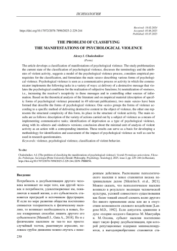 20. Чулошников А.И. Психологическое насилие сквозь призму деятельностного подхода // Вестник Пермского университета. Философия. Психология. Социология. 2023. Вып. 1. С. 84-97. DOI: 10.17072/2078-7898/2023-1-84-97 EDN: EHCTEB