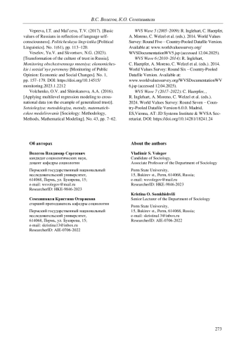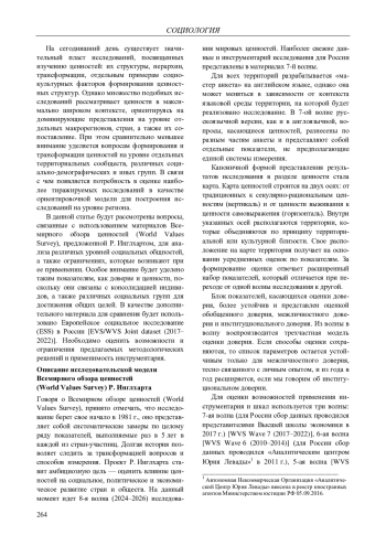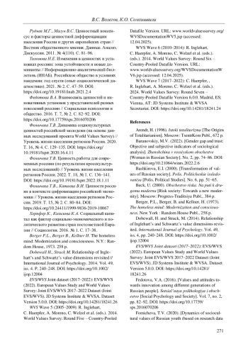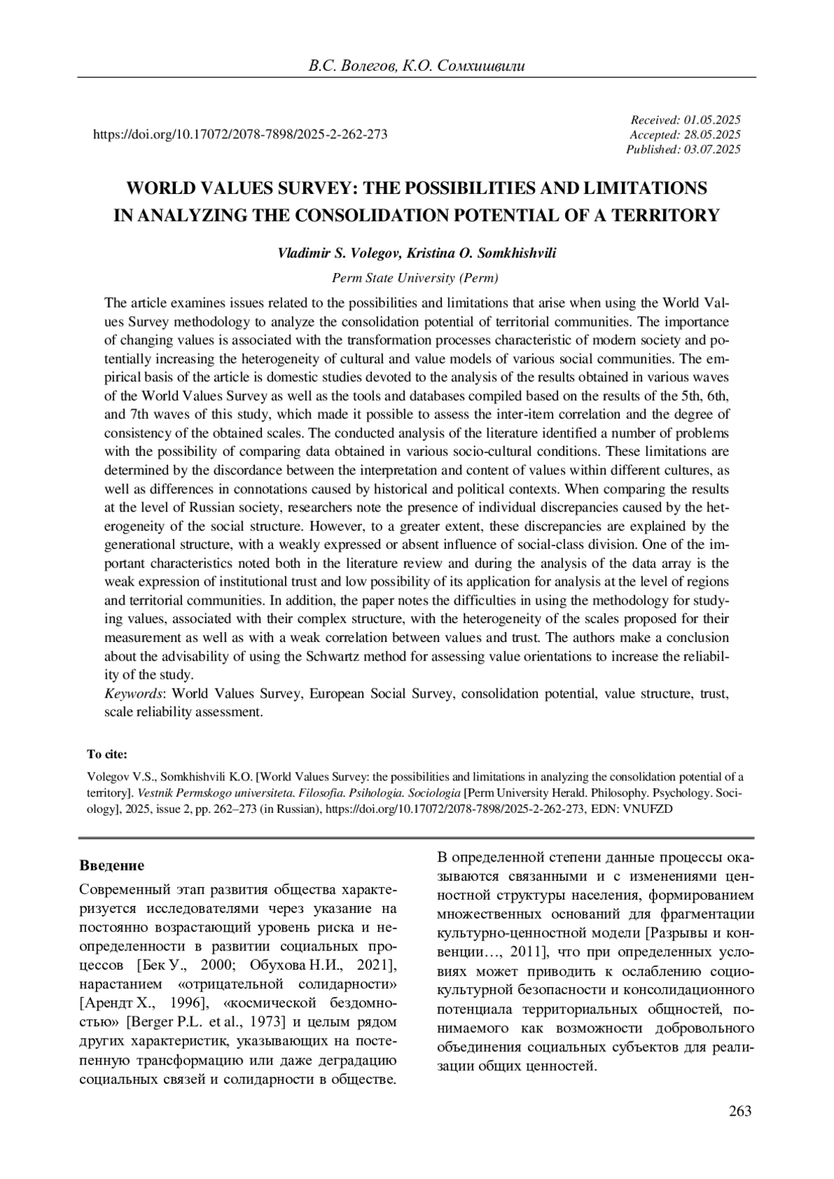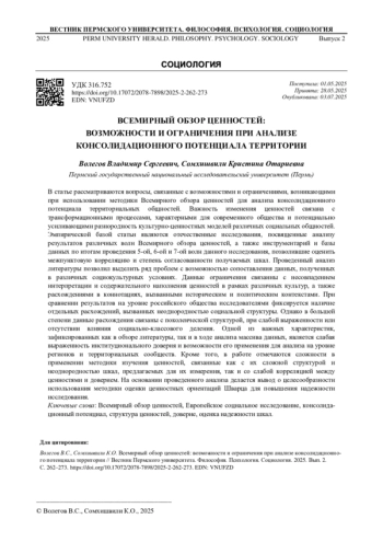 ВОЛЕГОВ В. С., СОМХИШВИЛИ К. О. ВСЕМИРНЫЙ ОБЗОР ЦЕННОСТЕЙ: ВОЗМОЖНОСТИ И ОГРАНИЧЕНИЯ ПРИ АНАЛИЗЕ КОНСОЛИДАЦИОННОГО ПОТЕНЦИАЛА ТЕРРИТОРИИ // ВЕСТНИК ПЕРМСКОГО УНИВЕРСИТЕТА. ФИЛОСОФИЯ. ПСИХОЛОГИЯ. СОЦИОЛОГИЯ. 2025. № 2