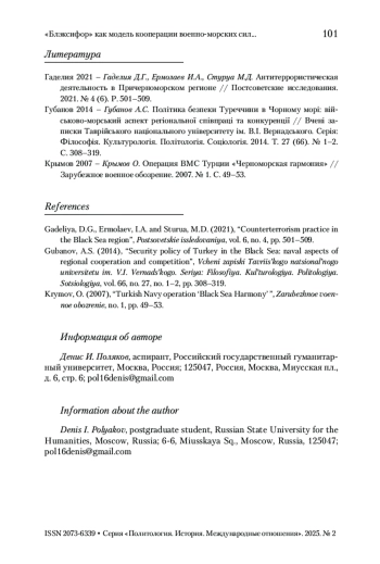 2. Губанов 2014 - Губанов А.С. Політика безпеки Туреччини в Чорному морі: військово-морський аспект регіональної співпраці та конкуренції // Вчені записки Таврійського національного університету ім. В.І. Вернадського. Серія: Філософія. Культурологія. Політологія. Соціологія. 2014. Т. 27 (66). № 1-2. С. 308-319.