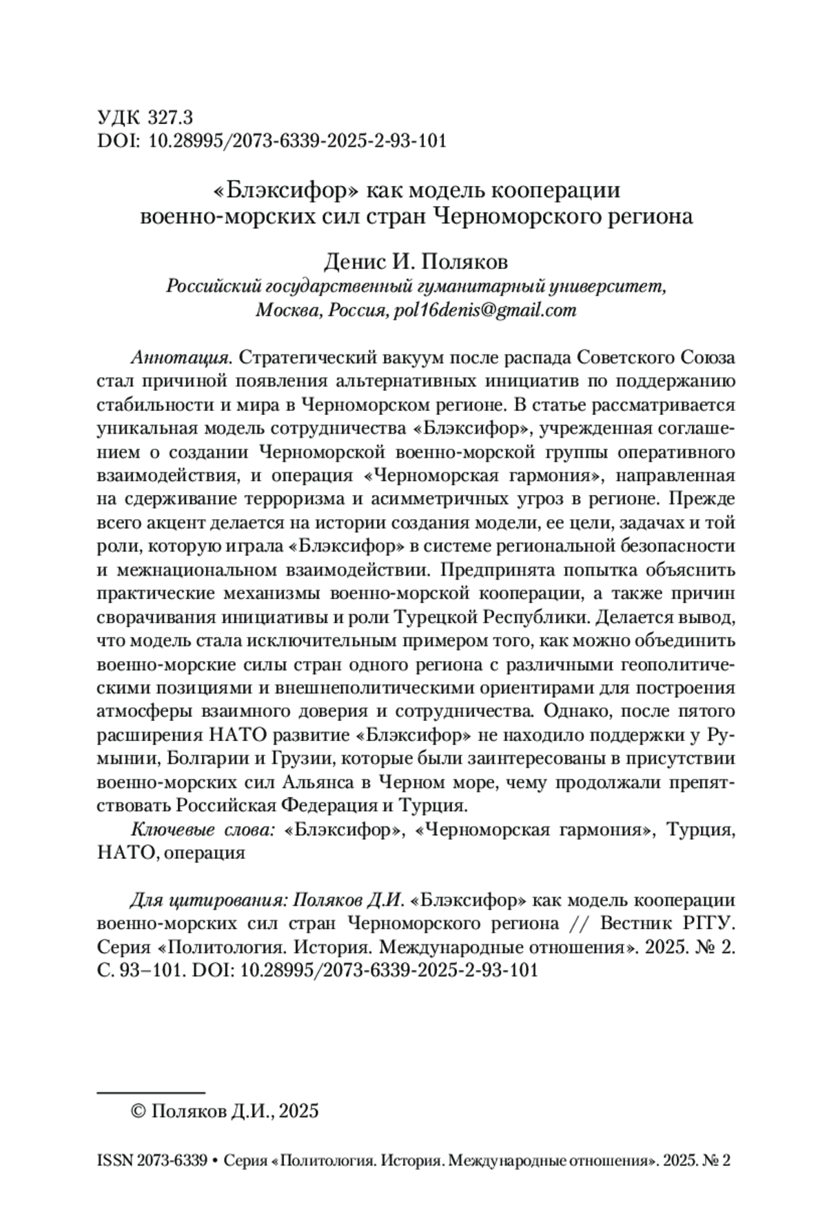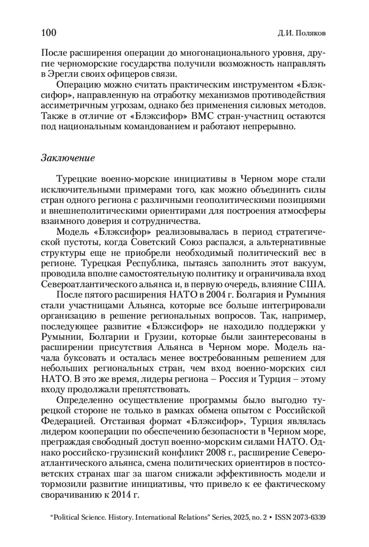 Стратегический вакуум после распада Советского Союза стал причиной появления альтернативных инициатив по поддержанию стабильности и мира в Черноморском регионе. В статье рассматривается уникальная модель сотрудничества «Блэксифор», учрежденная соглашением о создании Черноморской военно-морской группы оперативного взаимодействия, и операция «Черноморская гармония», направленная на сдерживание терроризма и асимметричных угроз в регионе. Прежде всего акцент делается на истории создания модели, ее цели, задачах и той роли, которую играла «Блэксифор» в системе региональной безопасности и межнациональном взаимодействии. Предпринята попытка объяснить практические механизмы военно-морской кооперации, а также причин сворачивания инициативы и роли Турецкой Республики. Делается вывод, что модель стала исключительным примером того, как можно объединить военно-морские силы стран одного региона с различными геополитическими позициями и внешнеполитическими ориентирами для построения атмосферы взаимного доверия и сотрудничества. Однако, после пятого расширения НАТО развитие «Блэксифор» не находило поддержки у Румынии, Болгарии и Грузии, которые были заинтересованы в присутствии военно-морских сил Альянса в Черном море, чему продолжали препятствовать Российская Федерация и Турция.