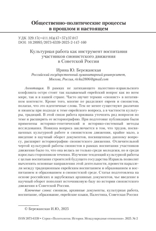 В рамках не затихающего палестино-израильского конфликта остро стоит так называемый еврейский вопрос как во всем мире, так и в нашей стране. Часто звучит термин «сионист» в негативном контексте. Кроме того, многие не разделяют евреев и сионистов, полагая, что это идентичные слова. Тем не менее существуют различия и нюансы при подходе к теме еврейского вопроса, а в частности культуры, традиций. В этой связи работа призвана уточнить ряд вопросов по теме и расширить ее историографию. При подготовке публикации были применены историко-генетический и историко-системный методы исследования. Новизна вопроса заключается в том, что трудов, посвященных культурной работе в сионистском движении, крайне мало, а введение в научный оборот документов, посвященных данному вопросу, расширит историографию сионистского движения. Отличительной чертой культурной работы сионистов в рамках воспитания участников движения было то, что она велась не только среди молодежи, но и среди взрослых сторонников течения. Изучение тенденций культурной работы с целью воспитания строителей будущего государства Израиль позволит вычленить основные направления этой деятельности, провести параллели между традиционным еврейским воспитанием и образованием и воспитанием и образованием в сионистской среде. Статья подготовлена на основе российских и зарубежных архивных документов, чье введение в научный оборот пополнит источниковую базу по истории сионистского движения в Советской России.