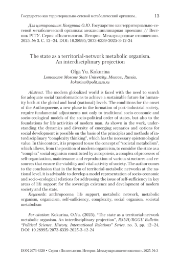 Современный глобализированный мир сталкивается с необходимостью поиска адекватных общественных преобразований для достижения устойчивого будущего человечества как на глобальном, так и на локальном (национальном) уровнях. Условия наступления антропоцена, новой фазы становления постиндустриального общества, требуют фундаментальной корректировки не только традиционных социоэкономических и социоэкологических моделей общественно-политического уклада государств, но и основ жизнедеятельности современного человека. Как показано в работе, понимание динамики и разнообразия возникающих сценариев и вариантов общественного развития возможно на основе принципов и методов междисциплинарного «сложностного мышления», обладающего необходимой эпистемологической ценностью. В этом контексте в работе предлагается использовать концепцию «социетального метаболизма», позволяющую с позиции современного органицизма рассматривать государство как «сложностный» социальный организм, конституированный аутопойезисом, комплексом процессов самоорганизации, поддержания и воспроизводства разнообразных структур и ресурсов, обеспечивающих жизнеспособность и жизнедеятельность общества. Автор приходит к выводу о целесообразности разработки в форме территориально-метаболических сетей национального уровня, модельного представления социально-экономических и социально-экологических отношений для решения проблемы самодостаточности в ключевых сферах жизнеобеспечения для суверенного существования и развития современного общества и государства.