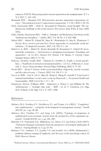 1. Алексеев и др. 2021 - Алексеев М.А., Фрейдина Е.В., Петухова С.В., Тропин А.А. «Сложность» и «сложностность» - категории развития систем управления // Вестник НГУЭУ. 2021. № 1. С. 48-66.