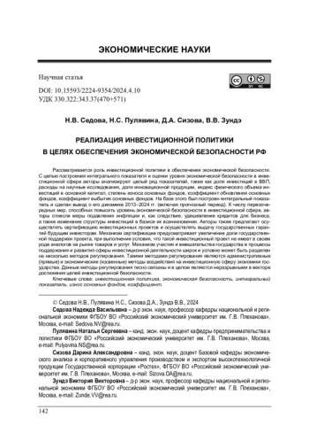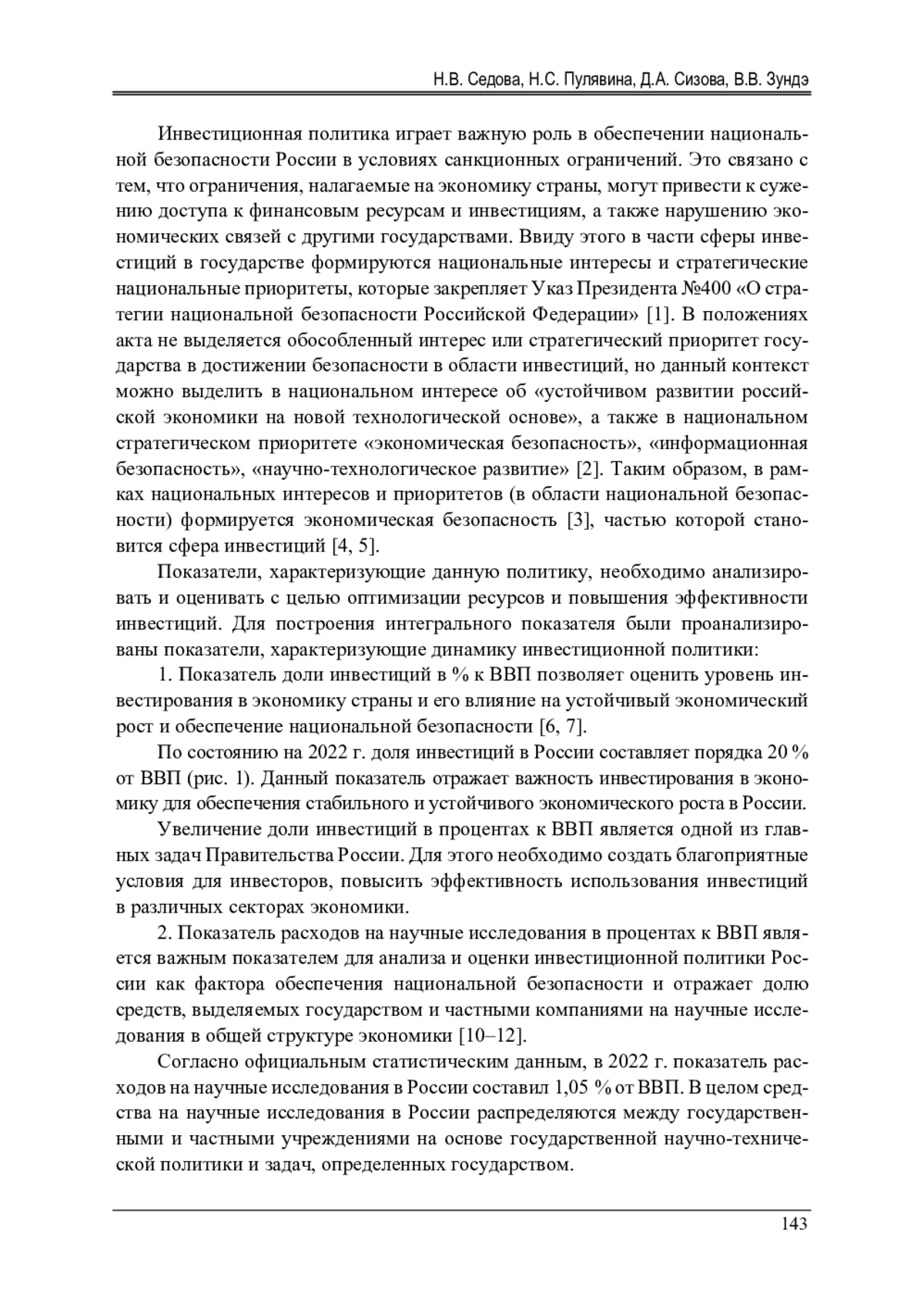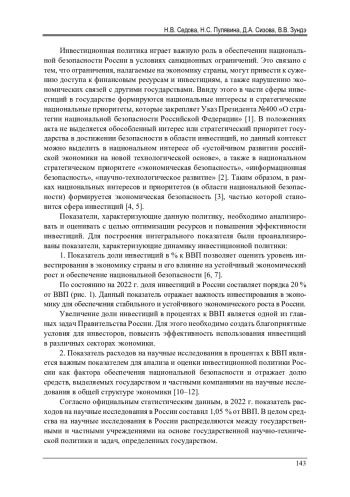 Инвестиционная политика играет важную роль в обеспечении национальной безопасности России в условиях санкционных ограничений. Это связано с тем, что ограничения, налагаемые на экономику страны, могут привести к сужению доступа к финансовым ресурсам и инвестициям, а также нарушению экономических связей с другими государствами. Ввиду этого в части сферы инвестиций в государстве формируются национальные интересы и стратегические национальные приоритеты, которые закрепляет Указ Президента No400 «О стратегии национальной безопасности Российской Федерации» [1]. В положениях акта не выделяется обособленный интерес или стратегический приоритет государства в достижении безопасности в области инвестиций, но данный контекст можно выделить в национальном интересе об «устойчивом развитии российской экономики на новой технологической основе», а также в национальном стратегическом приоритете «экономическая безопасность», «информационная безопасность», «научно-технологическое развитие» [2]. Таким образом, в рамках национальных интересов и приоритетов (в области национальной безопасности) формируется экономическая безопасность [3], частью которой становится сфера инвестиций