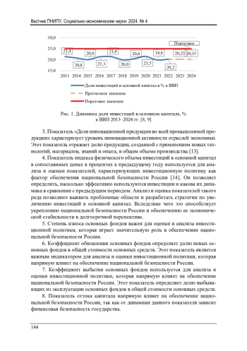 Рассматривается роль инвестиционной политики в обеспечении экономической безопасности. С целью построения интегрального показателя и оценки уровня экономической безопасности в инвестиционной сфере авторы анализируют целый ряд показателей, такие как доля инвестиций в ВВП, расходы на научные исследования, доля инновационной продукции, индекс физического объема инвестиций в основной капитал, степень износа основных фондов, коэффициент обновления основных фондов, коэффициент выбытия основных фондов. На базе этого был построен интегральный показатель и сделан вывод о его динамике 2013-2024 гг. (включая прогнозный период). К числу первоочередных мер, способных повысить уровень экономической безопасности в инвестиционной сфере, авторы отнесли меры подавления инфляции и, как следствие, удешевление кредитов для бизнеса, а также изменение структуры инвестиций в базисе их возникновения. Авторы также предлагают осуществлять сертификацию инвестиционных проектов и осуществлять выдачу государственных гарантий будущим инвесторам. Механизм сертификации предусматривает увеличение доли государственной поддержки проекта, при выполнении условия, что такой инвестиционный проект не имеет в своем роде аналогов на рынке товаров и услуг. Механизм участия и вмешательства государства в процессы поддержания и развития сферы инвестиционной деятельности широк и условно может быть разделен на несколько методов регулирования. Такими методами регулирования являются административные (прямые) и экономические (косвенные) методы воздействия на инвестиционную сферу экономики государства. Данные методы регулирования тесно связаны и в целом являются неразрывными в векторе достижения целей инвестиционной безопасности.