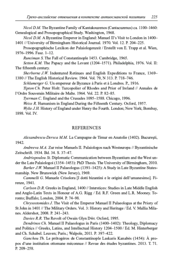 35. Nicol D.M. A Byzantine Emperor in England: Manuel II’s Visit to London in 1400-1401 // University of Birmingham Historical Journal. 1970. Vol. 12. P. 204-225.