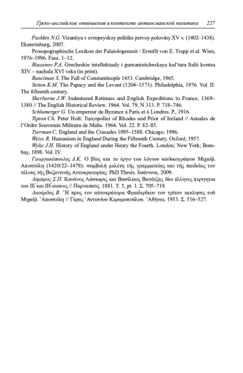 18. Gray H.L. Greek Visitors to England 1455-1456 // Anniversary essays in Medieval History by Students of Charles Homer Haskins presented on his completion of forty years of teaching. Boston; New York., 1929. P. 81-116.