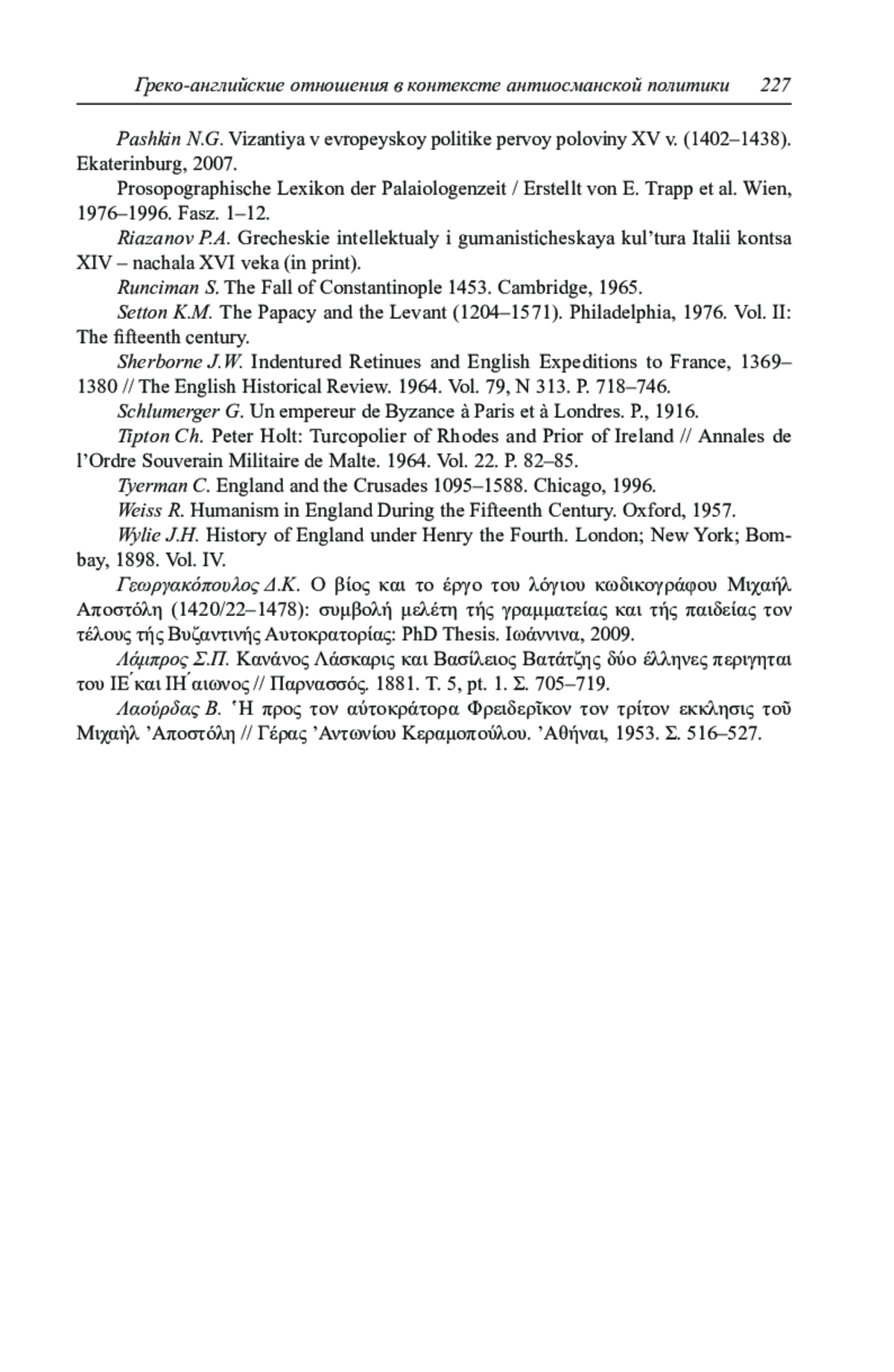 13. Carlson D.R. Greeks in England, 1400 // Interstices: Studies in Late Middle English and Anglo-Latin Texts in Honour of A.G. Rigg / Ed. R.F Green, L.R. Mooney. Toronto; Buffalo; London, 2004. P. 74-98.