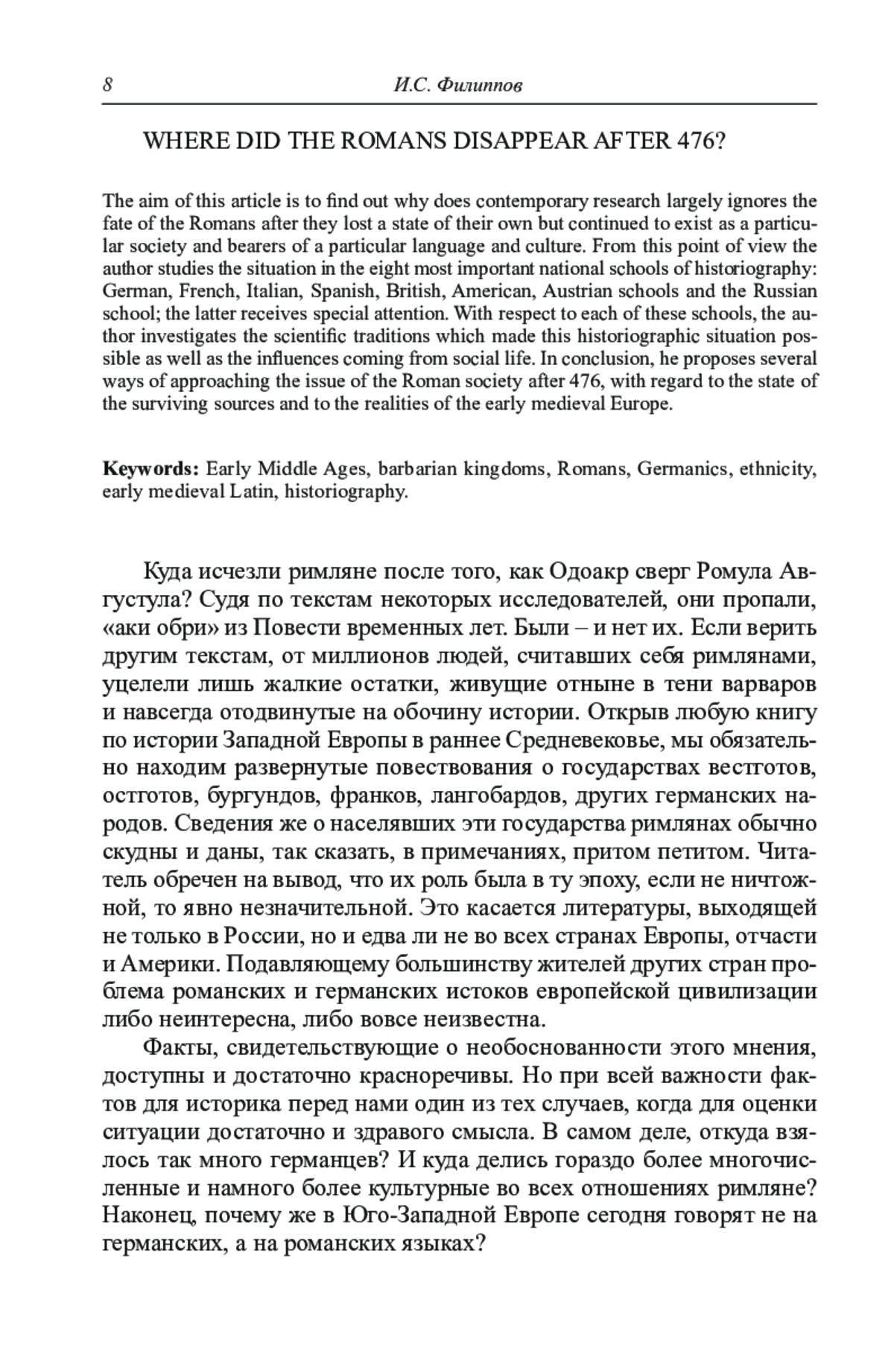 Куда исчезли римляне после того, как Одоакр сверг Ромула Августула? Судя по текстам некоторых исследователей, они пропали, «аки обри» из Повести временных лет. Были – и нет их. Если верить другим текстам, от миллионов людей, считавших себя римлянами, уцелели лишь жалкие остатки, живущие отныне в тени варваров и навсегда отодвинутые на обочину истории. Открыв любую книгу по истории Западной Европы в раннее Средневековье, мы обязательно находим развернутые повествования о государствах вестготов, остготов, бургундов, франков, лангобардов, других германских народов. Сведения же о населявших эти государства римлянах обычно скудны и даны, так сказать, в примечаниях, притом петитом. Читатель обречен на вывод, что их роль была в ту эпоху, если не ничтожной, то явно незначительной. Это касается литературы, выходящей не только в России, но и едва ли не во всех странах Европы, отчасти и Америки. Подавляющему большинству жителей других стран проблема романских и германских истоков европейской цивилизации либо неинтересна, либо вовсе неизвестна