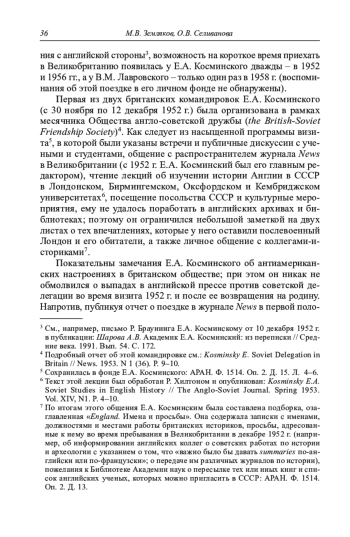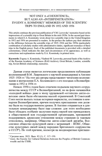 Данная статья является логическим продолжением публикации воспоминаний В. М. Лавровского о научной командировке в Англию 1925–1926 гг.1 На этот раз авторы представляют читателям воспоминания и впечатления Е. А. Косминского о его поездках в Великобританию в 1952 и 1956 гг.