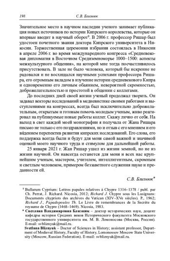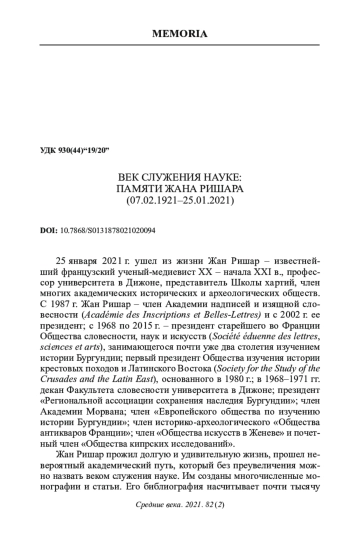 25 января 2021 г. ушел из жизни Жан Ришар – известнейший французский ученый-медиевист XX – начала XXI в., профессор университета в Дижоне, представитель Школы хартий, член многих академических исторических и археологических обществ. С 1987 г. Жан Ришар – член Академии надписей и изящной словесности (Académie des Inscriptions et Belles-Lettres) и с 2002 г. ее президент; с 1968 по 2015 г. – президент старейшего во Франции Общества словесности, наук и искусств (Société éduenne des lettres, sciences et arts), занимающегося почти уже два столетия изучением истории Бургундии; первый президент Общества изучения истории крестовых походов и Латинского Востока (Society for the Study of the Crusades and the Latin East), основанного в 1980 г.; в 1968–1971 гг. декан Факультета словесности университета в Дижоне; президент «Региональной ассоциации сохранения наследия Бургундии»; член Академии Морвана; член «Европейского общества по изучению истории Бургундии»; член историко-археологического «Общества антикваров Франции»; член «Общества искусств в Женеве» и почетный член «Общества кипрских исследований».