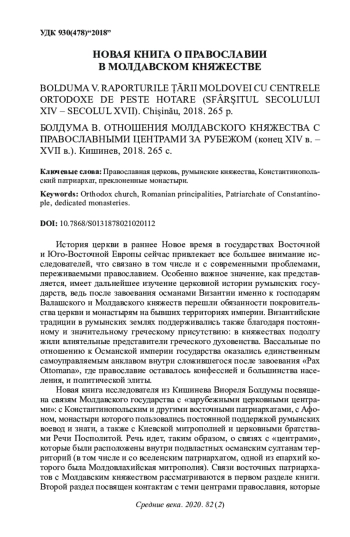 Статья: НОВАЯ КНИГА О ПРАВОСЛАВИИ В МОЛДАВСКОМ КНЯЖЕСТВЕ BOLDUMA V. RAPORTURILE ȚăRII MOLDOVEI CU CENTRELE ORTODOXE DE PESTE HOTARE (SFâRșITUL SECOLULUI XIV - SECOLUL XVII). CHIșINăU, 2018. 265 P. / БОЛДУМА В. ОТНОШЕНИЯ МОЛДАВСКОГО КНЯЖЕСТВА С ПРАВОСЛАВНЫМИ ЦЕНТРАМИ ЗА РУБЕЖОМ (КОНЕЦ XIV В. - XVII В.). КИШИНЕВ, 2018. 265 С. (2021)