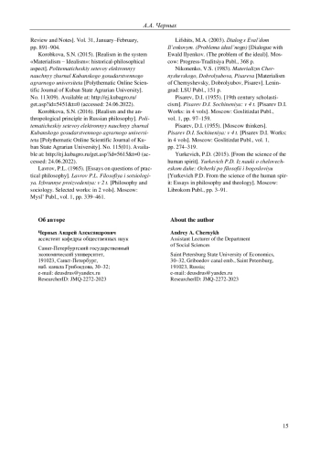 9. Коробкова С.Н. Реализм и антропологический принцип в русской философии // Политематический сетевой электронный научный журнал Кубанского государственного аграрного университета. 2016. № 115(01). URL: http://ej.kubagro.ru/get.asp?id=5615&t=0 (дата обращения: 24.06.2022). EDN: VJLRQZ