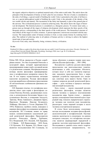 В статье рассматривается вопрос о смысле бытия как процесса восстановления всеединства мира и роли человека в этом процессе. Миссия человека, по мысли русских религиозных философов «серебряного века», заключается в организации жизни таким образом, чтобы обеспечить собирание мира в единую, цельную социальную систему. Именно человек является проводником идеи всеединства в природном мире. Такое духовное преобразование мира под руководством человека должно достигаться в результате органического субъектно-объективного или духовно-материального единения всего миропорядка. В статье рассмотрен закон всеединства как единство всего сущего, особая модель построения мира. Всеединство есть принцип тождества двух миров (божественного и природного). Воплощение Божества в человечество входит в общий план мироздания. Цивилизационный процесс направлен на достижение всеединства. Показаны этапы исторического развития. Исторический процесс рассматривается как процесс теогонический. Для восстановления внутреннего единства человек должен пройти все этапы религиозного развития, которые представляют три эпохи теогонического процесса, соответствующие трем эпохам мирового процесса. Иерархическая структура человека отражает все ступени космического бытия. Человек представляет микрокосмос, связанный с макрокосмосом. Трансцендентное средоточение человеческого бытия есть Бог, таким образом, человек творит историю, реализуя замысел Бога. Методом достижения всеединства во всех сферах деятельности человек является устремленность к достижению высшего нравственного состояния человека и общества.