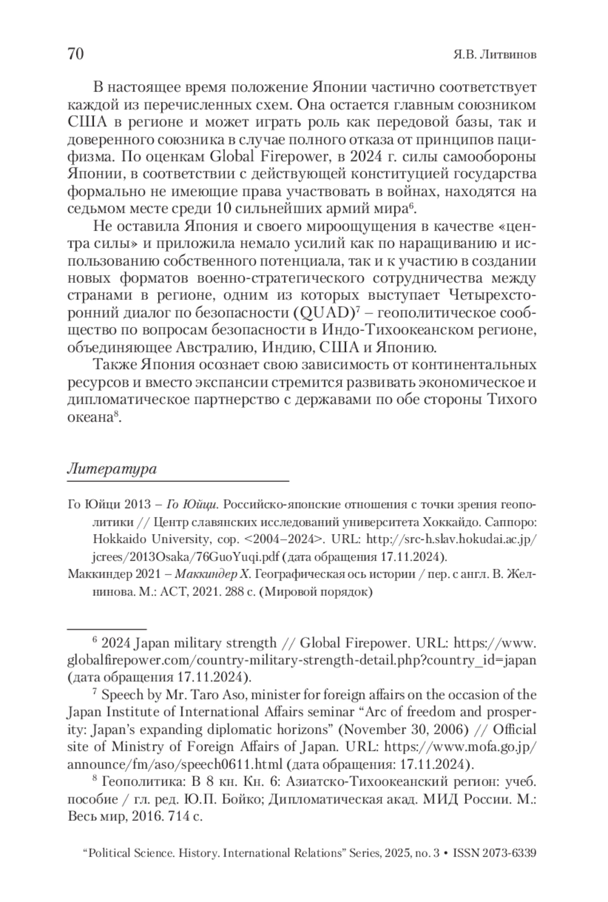 1. Го Юйци 2013 - Го Юйци. Российско-японские отношения с точки зрения геополитики // Центр славянских исследований университета Хоккайдо. Саппоро: Hokkaido University, сор. <2004-2024>. URL: http://src-h.slav.hokudai.ac.jp/jcrees/2013Osaka/76GuoYuqi.pdf (дата обращения 17. 11. 2024).