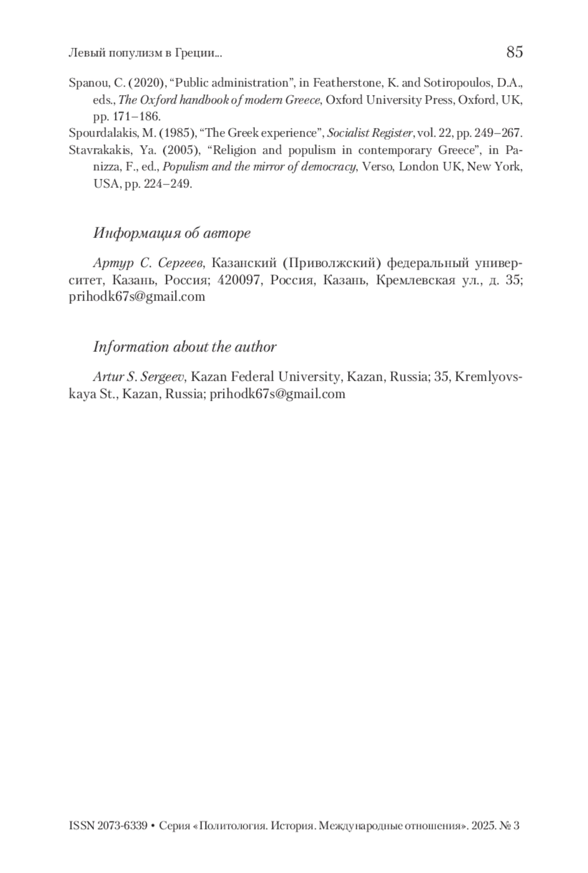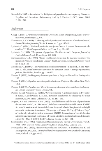 5. Lyrintzis 1987 - Lyrintzis C. The power of populism: The Greek case // European Journal of Political Research. 1987. Vol. 15. No. 6. P. 667-686.