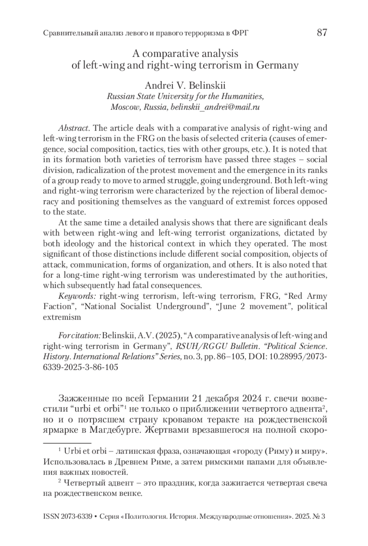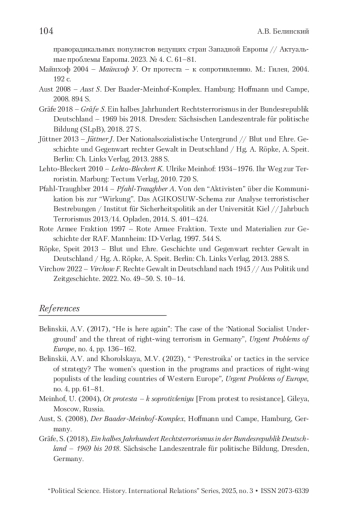 1. Белинский 2017 - Белинский А.В. «Он снова здесь»: Дело «Национал-социалистического подполья» и угроза правого терроризма в Германии // Актуальные проблемы Европы. 2017. № 4. С. 136-162.