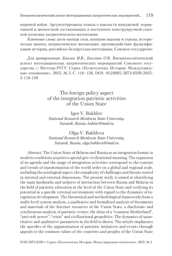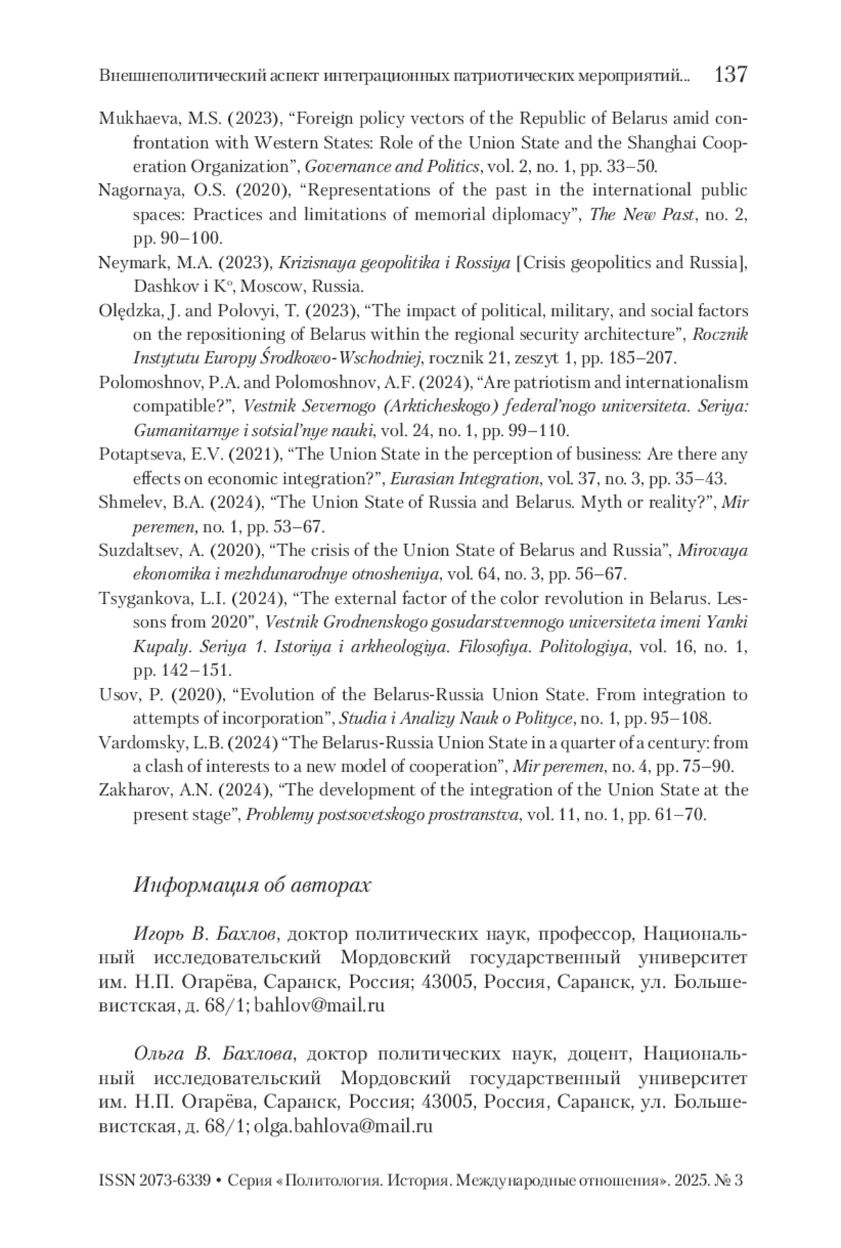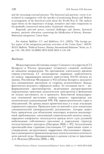 БАХЛОВ И. В., БАХЛОВА О. В. ВНЕШНЕПОЛИТИЧЕСКИЙ АСПЕКТ ИНТЕГРАЦИОННЫХ ПАТРИОТИЧЕСКИХ МЕРОПРИЯТИЙ СОЮЗНОГО ГОСУДАРСТВА // ВЕСТНИК РГГУ. СЕРИЯ: ПОЛИТОЛОГИЯ. ИСТОРИЯ. МЕЖДУНАРОДНЫЕ ОТНОШЕНИЯ. 2025. № 3