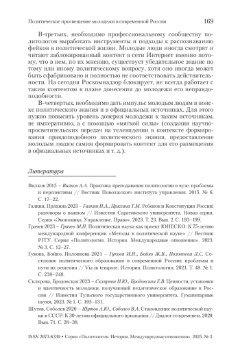 4. Гукова, Бойко, Половнева 2021 - Гукова И.Н., Бойко Ж.В., Половнева Л.C. Состояние политического образования в современной России: проблемы и пути их решения // Via in tempore. История. Политология. 2021. Т. 48. № 1. С. 238-248.
