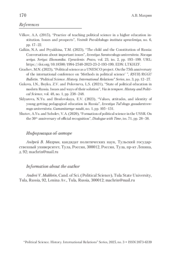 1. Вилков 2015 - Вилков А.А. Практика преподавания политологии в вузе: проблемы и перспективы // Вестник Поволжского института управления. 2015. № 6. С. 17-22.