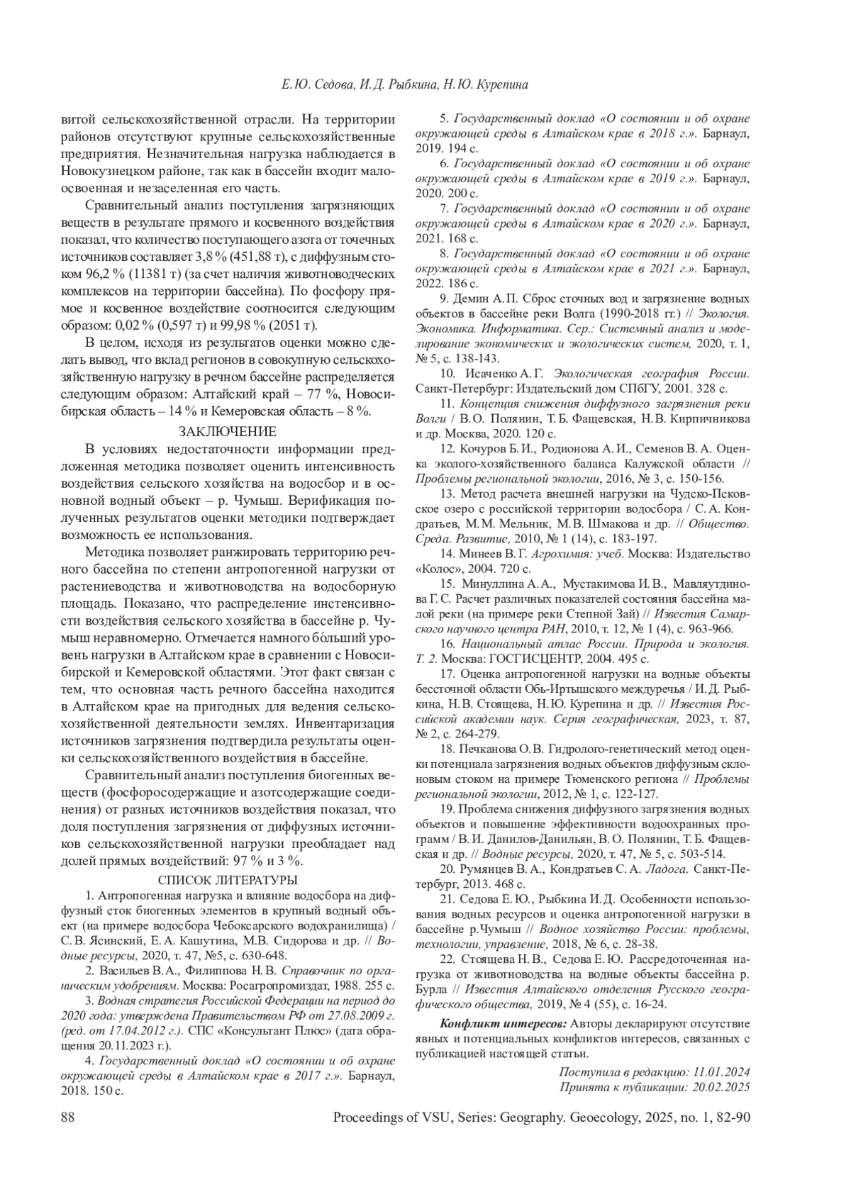 22. Стоящева Н.В., Седова Е.Ю. Рассредоточенная нагрузка от животноводства на водные объекты бассейна р. Бурла // Известия Алтайского отделения Русского географического общества, 2019, № 4 (55), с. 16-24. EDN: NGFWIG