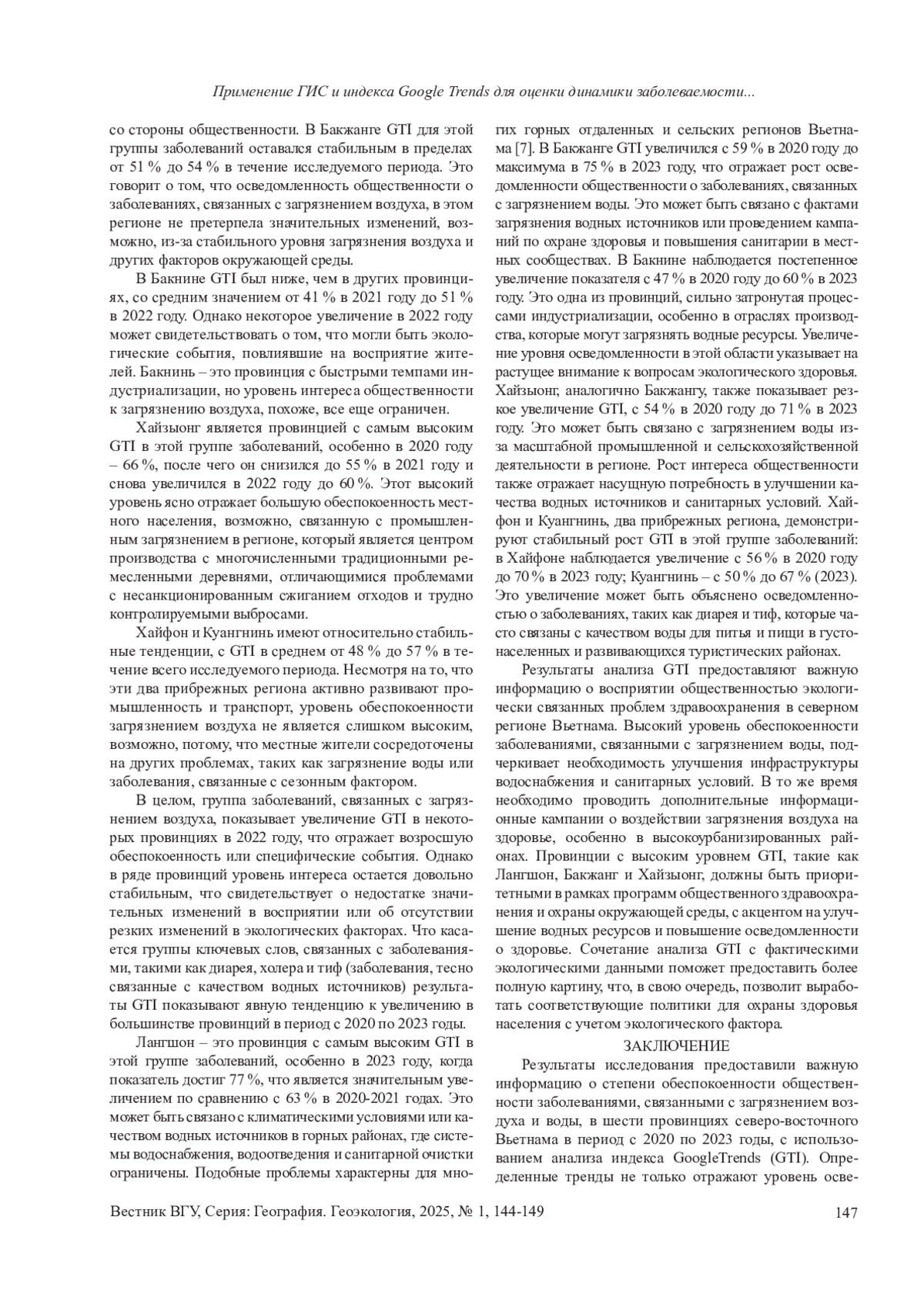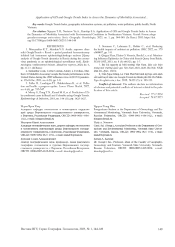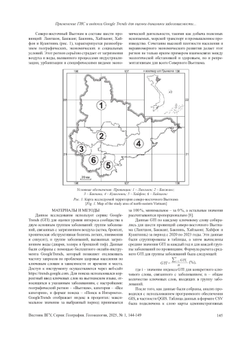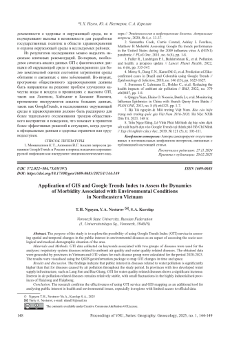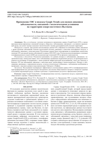 В последние десятилетия влияние экологических факторов на здоровье населения стало одной из важнейших глобальных проблем. Быстрое увеличение интенсивности загрязнения окружающей среды, вызванное промышленной деятельностью, транспортом, сельским хозяйством и урбанизацией, привело к серьёзным негативным изменениям в состоянии компонентов природы и природных систем в целом, которые приводят к ухудшению здоровья населения [1, 3]. В развивающихся странах, таких как Вьетнам, эта проблема становится ещё более актуальной из-за ограниченности официальных данных о состоянии окружающей среды и здоровья населения. В этом контексте использование цифровых инструментов, таких как сервис GoogleTrends (GTI) в сочетании с геоинформационными системами (ГИС), открывает новые эффективные методы изучения и оценки экологических и общественных проблем здоровья.