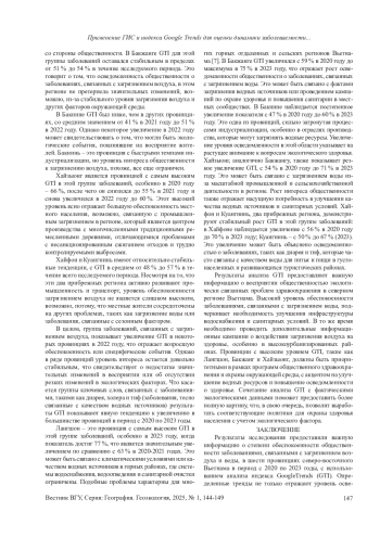 Цель исследования: изучение возможности применения сервиса GoogleTrends (GTI) в оценке пространственно-временных изменений интереса общества к заболеваниям, связанным с состоянием окружающей среды, как аспект оценки социально-экологической и медико-демографической ситуации территории. Материалы и методы. Для анализа использовались данные GTI, собранные по ключевым словам, связанным с двумя группами заболеваний: болезни дыхательной системы, связанные с качеством атмосферного воздуха, и заболевания, связанные с качеством воды. Полученные данные были геокодированы по провинциям, вычислены значения GTI для каждой группы заболеваний за период 2020-2023 годы. Результаты визуализированы с помощью геоинформационного пакета QGIS для построения карт изменений GTI во времени и пространстве. Результаты и обсуждение. Результаты показывают, что уровень интереса к заболеваниям, связанным с загрязнением воды, значительно выше, чем к заболеваниям, вызванным загрязнением воздуха, на протяжении всего периода исследования. В провинциях с менее развитой инфраструктурой водоснабжения, таких как Лангшон и Бакжанг, GTI для заболеваний, связанных с качеством воды, демонстрирует значительный рост. Интерес к заболеваниям, связанным с загрязнением воздуха, остается относительно стабильным, с небольшими колебаниями в провинциях с высоким уровнем индустриализации: Хайзыонг и Хайфон. Заключение. Исследование подтверждает эффективность использования сервиса GTI и геоинформационного картографирования как дополнительного инструмента для анализа общественного интереса к вопросам здоровья и состояния окружающей среды, особенно в регионах с ограниченным доступом к официальным данным.