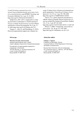 26. Englert B., Thaler J., Helmig B. Fit Themes in Volunteering: How Do Volunteers Perceive Person-Environment Fit? // Nonprofit and Voluntary Sector Quarterly. 2019. Vol. 49, iss. 2. P. 336-356. DOI: 10.1177/0899764019872005