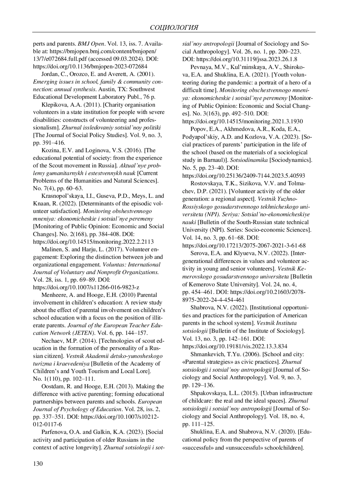 12. Попов Е.А., Ахмедова А.Р., Кода Е.А., Подъяпольский А.Д., Козлова В.А. Социальные практики участия родителей в жизнедеятельности школы (по материалам социологического исследования в г. Барнауле) // Социодинамика. 2023. № 5. С. 23-40. DOI: 10.25136/2409-7144.2023.5.40593 EDN: BIWJZL