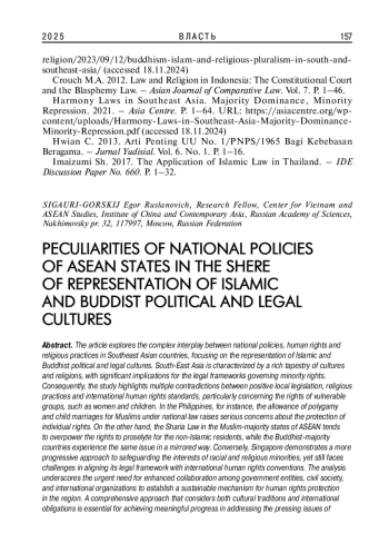 В статье исследуются вопросы взаимодействия между национальной политикой и религиозными практиками в странах Юго-Восточной Азии, акцентируя внимание на репрезентации исламской и буддийской политико-правовых культур. Рассматриваются коллизионные проблемы законодательства, обычных практик и международных стандартов прав человека. Анализ демонстрирует необходимость усиления сотрудничества между государственными структурами, гражданским обществом и международными организациями, что в перспективе является ключом к достижению инклюзивности и справедливости в регионе.