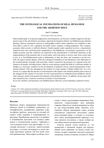 Марксистская философия в ее практическом применении (реальный гуманизм) способна стать надежной опорой для прогрессивной части антиабортного движения, противостоящего буржуазно-либеральной, неомальтузианской проабортной идеологии. Этому может поспособствовать марксистская онтологическая критика демографической политики при капитализме. С точки зрения К. Маркса, капитализм неизбежно формирует «избыточное» рабочее население. Такой «избыток» порождает либо нищету, либо искусственные аборты. Равенство полов получает при капитализме характерную рыночную и социал-дарвинистскую интерпретацию. Неомальтузианские социокультурные «проекции» рыночной экономики на область мировоззрения выражаются в абсолютизации автономии личности, недооценке потенциальной стороны социальной реальности, а также в стремлении получать от общества больше, чем отдавать ему. Если неомальтузианство стремится к расчеловечиванию, к тому, чтобы отказывать зародышу, а иногда даже новорожденному, в праве на человеческое достоинство, то онтологическим фундаментом реального гуманизма является утверждение сущностного тождества людей друг с другом, которое обеспечивается наличием у всех людей, включая зародышей, материального социального субстрата. Марксистская социальная онтология рассматривает рождение достаточного количества детей в качестве необходимого условия развития производительных сил и гуманизации производственных отношений. Это также предполагает создание большого количества высококвалифицированных рабочих мест. В качестве вывода утверждается, что практика реального гуманизма в отношении проблемы абортов должна состоять в борьбе за создание высококвалифицированных рабочих мест, реальную социальную защиту материнства и детства, а также за другие меры, направленные на общее развитие производительных сил. Кроме того, многодетность в семьях реальных гуманистов должна стать обычным явлением.