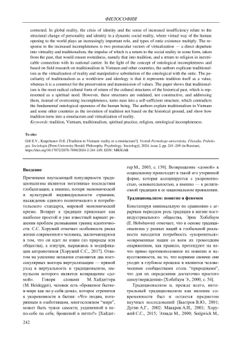 Статья посвящена феномену традиционализма в контексте онтологической недостаточности человека. В культуре существуют разные способы репрезентации недостаточности, которая может преодолеваться или корректироваться. В глобальной реальности кризис идентичности и усиление чувства нехватки связаны с изменением структур личности и идентичности в динамичной социальной реальности, где все большую роль играет виртуальный способ размыкания человека к миру, а также множатся виды онтического бытия. Ответом на усиление нехватки становятся два постсекулярных вектора виртуализации - прямой уход в виртуальность и традиционализм, импульсом которого является возвращение к социальному в такой его утерянной форме, которая бы обещала укорененность в традицию и возврат к религии в неразрывной связи с ее национальным носителем. В свете концепции онтологической недостаточности и на основе полевых исследований явлений традиционализма во Вьетнаме и других странах авторы эксплицируют традиционализм как виртуализацию реальности и манипулятивную подмену онтологического онтическим. Особенность традиционализма как мировоззрения и идеологии состоит в том, что она представляет саму традицию в качестве ценности, тогда как она есть механизм сохранения и передачи ценностей. Показано, что традиционализм представляет собой наиболее радикальную культурную форму возврата структур исторического прошлого, что представляется духовно необходимым. Однако эти структуры являются отжившими, неконструктивными и обращение к ним вместо преодоления недостаточности превращает человека в самодостаточную структуру, т. е. противоречит принципиальной онтологической открытости человека. Авторы объясняют традиционализм во Вьетнаме как изобретение традиции, не основанное на исторической почве, и показывают, как традиция превращается в симулякр и виртуализацию реальности.