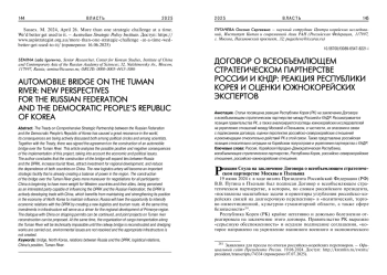 Статья посвящена реакции Республики Корея (РК) на заключение Договора о всеобъемлющем стратегическом партнерстве между Россией и КНДР. Рассматривается позиция правительства РК, а также анализируются взгляды южнокорейских исследователей на укрепление отношений между Москвой и Пхеньяном, в частности, их опасения в связи с подписанием договора, оценки перспектив российско-северокорейских отношений и рекомендации относительно действий РК в этой связи. Также представлена российская позиция относительно ситуации на Корейском полуострове и укрепления партнерства с КНДР.