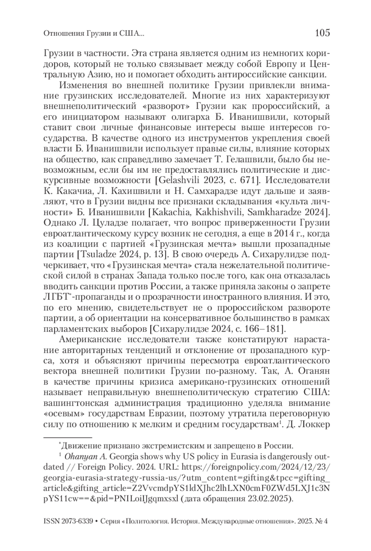 5. Fukuyama, Evgenidze 2025 - Fukuyama F., Evgenidze N. Russia is winning in Georgia // Foreign Affairs. 2025. Apr. 6. URL: https://www.foreignaffairs.com/georgia/russia-united-states-winning-georgia?check_logged_in=1&utm_medium=promo_email&utm_source=lo_flows&utm_campaign=article_link&utm_term=article_email&utm_content=20250302 (дата обращения 23.02.2025).