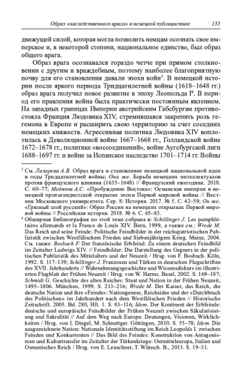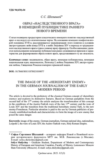 Статья посвящена предыстории классического немецкого понятия «наследственный враг» и исследует его отличительные черты. На основании немецких памфлетов второй половины XVII в. рассматривается трансформация этого понятия в условиях австро-турецких войн конца XVII в. и войн Людовика XIV и переход от традиционного наследственного врага-турка к новому врагу-французу. Особое внимание уделяется использованию немецкими публицистами ранее сложившихся приемов и характеристик для формирования образа нового врага, представлявшего ту же опасность.