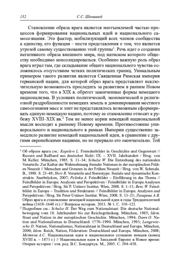 Становление образа врага является неотъемлемой частью про - цессов формирования национальных идей и национального самосознания. Это фактор, мобилизующий всех членов сообщества к единству, его функция – нести представления о том, что является угрозой самому существованию этой группы 1. Речь идет о создании негативного образа внешнего мира, под натиском которого обществу необходимо консолидироваться. Особенно важную роль образ врага играл там, где складывание общего национального чувства осложнялось отсутствием четких политических границ. Уникальным примером такого развития является Священная Римская империя германской нации, для которой образ врага представляет исключительную возможность проследить за развитием в раннем Новом времени того, что в XIX в. обретет законченные формы немецкого национализма. В условиях политической, экономической и религиозной раздробленности немецких земель и доминирования местного самосознания масс и элит не представлялось возможным сформировать единую немецкую нацию, поэтому ее становление относят к рубежу XVIII–XIX вв.