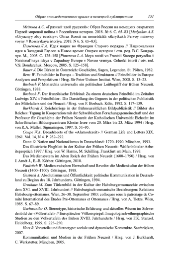 49. Wrede M. Das Reich und seine Feinde: Politische Feindbilder in der reichspatriotischen Publizistik zwischen Westfälischem Frieden und Siebenjährigem Krieg. Mainz, 2004.