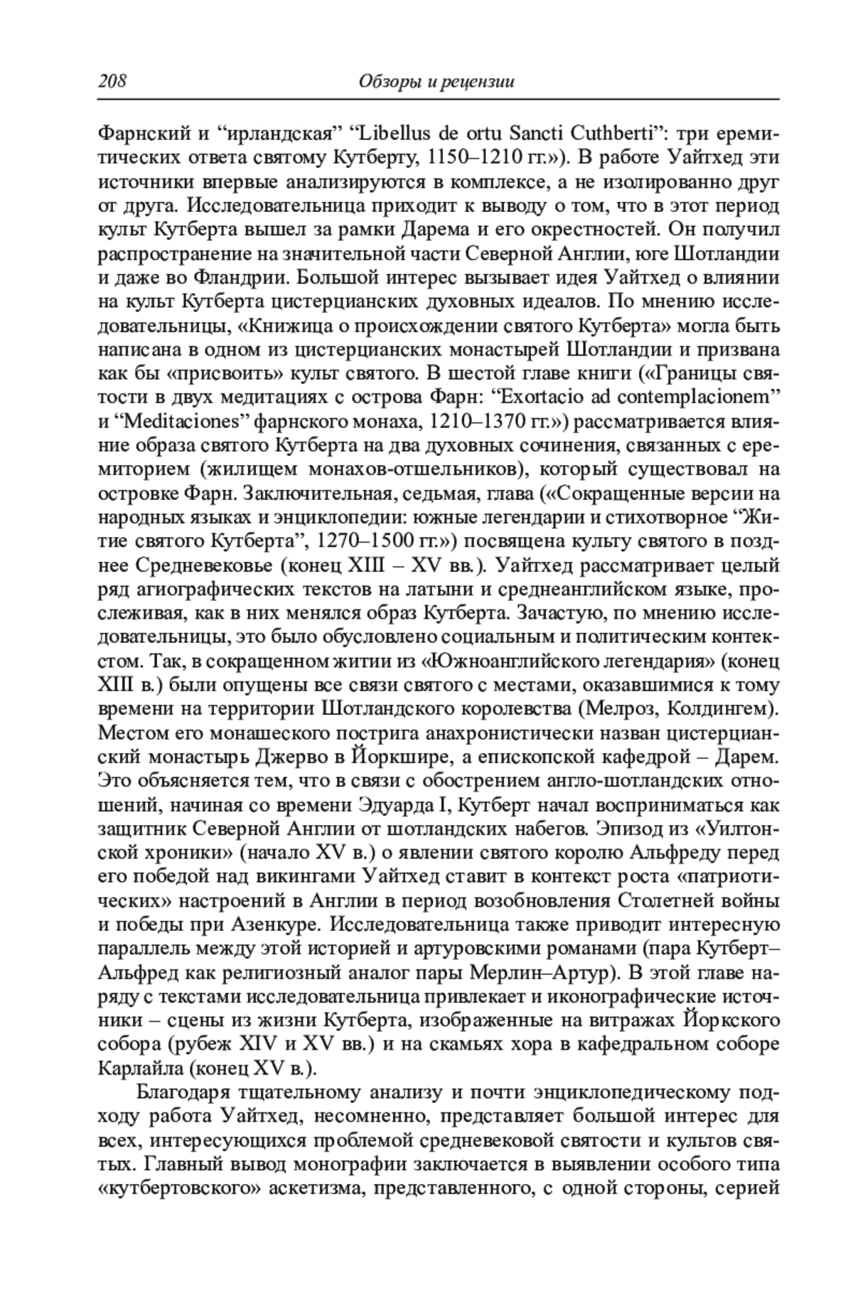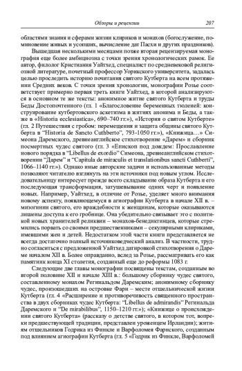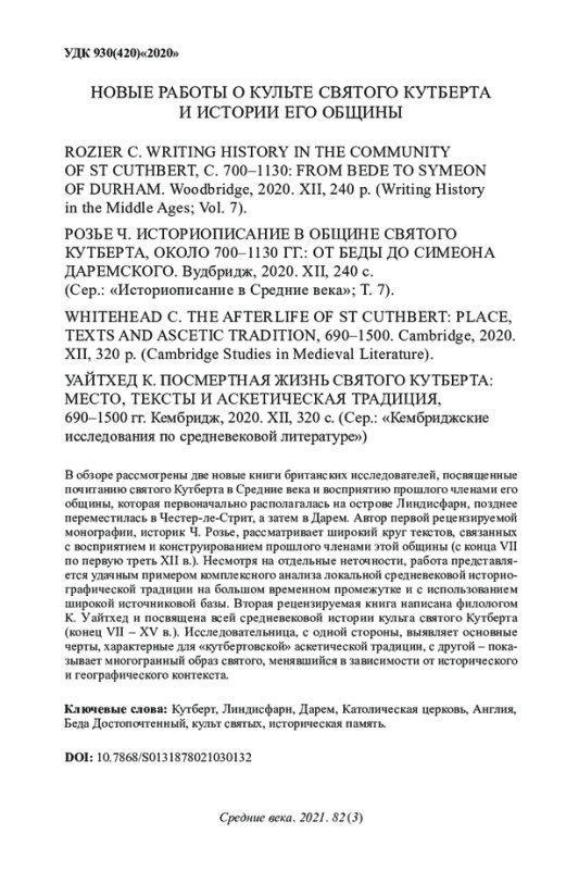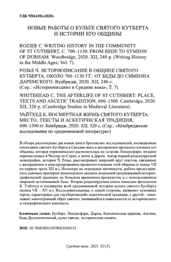 В обзоре рассмотрены две новые книги британских исследователей, посвященные почитанию святого Кутберта в Средние века и восприятию прошлого членами его общины, которая первоначально располагалась на острове Линдисфарн, позднее переместилась в Честер-ле-Стрит, а затем в Дарем. Автор первой рецензируемой монографии, историк Ч. Розье, рассматривает широкий круг текстов, связанных с восприятием и конструированием прошлого членами этой общины (с конца VII по первую треть XII в.). Несмотря на отдельные неточности, работа представляется удачным примером комплексного анализа локальной средневековой историографической традиции на большом временном промежутке и с использованием широкой источниковой базы. Вторая рецензируемая книга написана филологом К. Уайтхед и посвящена всей средневековой истории культа святого Кутберта (конец VII – XV в.). Исследовательница, с одной стороны, выявляет основные черты, характерные для «кутбертовской» аскетической традиции, с другой – показывает многогранный образ святого, менявшийся в зависимости от исторического и географического контекста