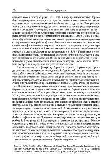 Изучение средневековой агиографии, как в контексте менявшихся представлений о святости, так и в связи с историописанием и знанием о прошлом людей Средневековья, принадлежит к числу наиболее динамично развивающихся направлений современной медиевистики. Очередным подтверждением этому служит выход в свет в 2020 г. двух рецензируемых монографий. В заглавии обеих фигурирует святой Кутберт – один из наиболее известных церковных деятелей раннесредневековой Англии. Поскольку на русском языке о нем написано не так много, нелишне будет коротко очертить основные вехи жизни и посмертной судьбы этого святого. Около 651 г. юноша Кутберт, вероятно принадлежавший к народу англов, принял монашеский постриг в монастыре Мелроз, основанном действовавшими на территории англосаксонского королевства Нортумбрия ирландскими миссионерами.